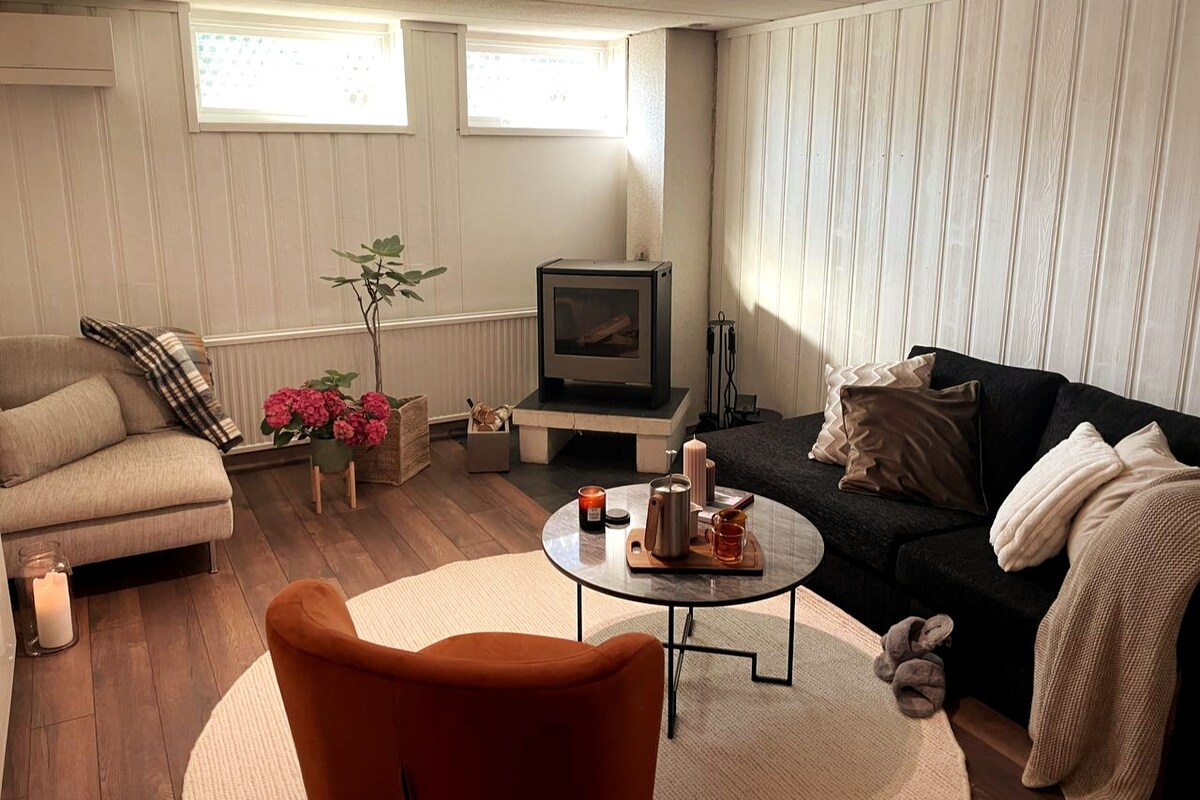 Welcome to your peaceful retreat! Our spacious downstairs suite in central Arvika is perfect for relaxing. Enjoy a generous living area, with spacious bedroom, private sauna, and refreshing shower. The suite is entirely private, though we share the entrance. Cozy up by the fireplace and use the fully equipped shared kitchen. Breakfast is available on request. Benefit from free parking and explore Arvika easily. Two bikes are available for local adventures. Book now for a serene stay!