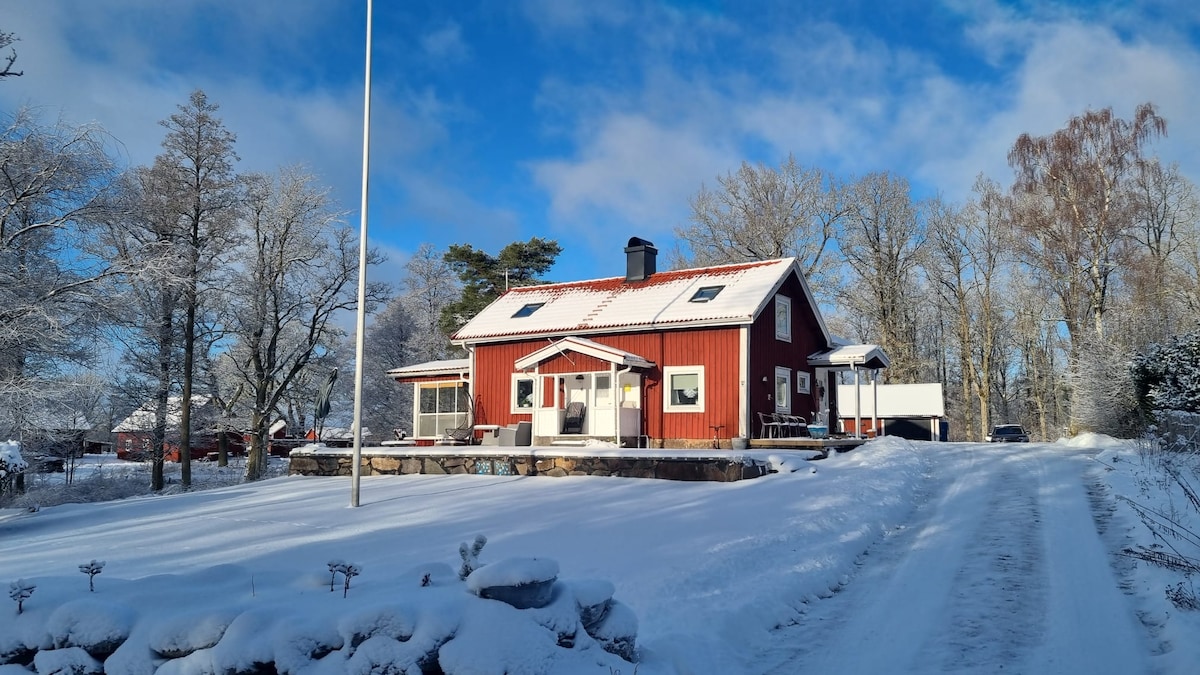 La maison d'été "Sjöbranten" est entourée d'arbres et donne sur un lac. Il n'y a pas de voisins visibles, vous pouvez donc profiter de la tranquillité de la forêt. Pont de baignade privé avec barque, kayaks gonflables, paddle board et divers animaux de baignade. Terrasse d'où l'on peut profiter de la vue sur le lac La maison n'est pas luxueuse mais spacieuse, confortable et incroyablement belle. 7 lits dans 3 chambres et 4 lits supplémentaires dans une annexe non chauffée. NB : Le sol de la salle de bain s'est affaissé, ce qui signifie que le bain doit être pris assis dans la baignoire