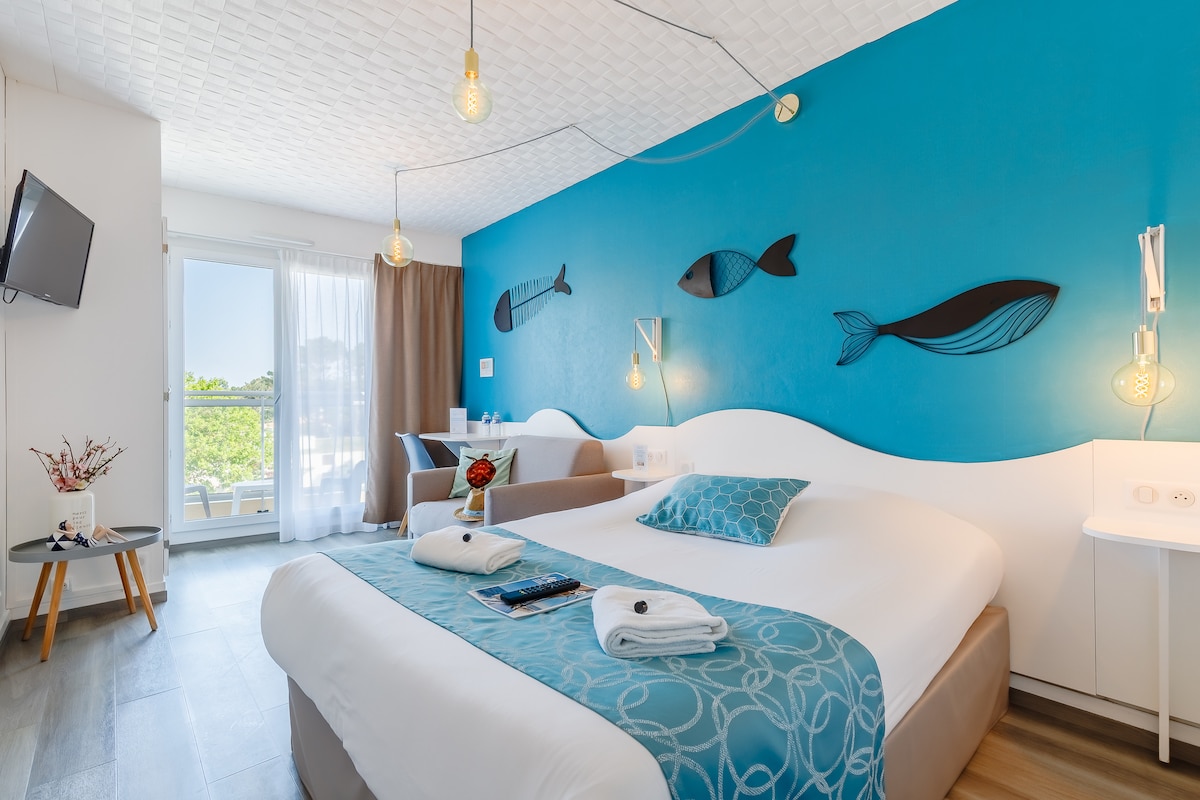 Nous vous proposons une chambre double confortable et élégante, idéale pour un séjour en couple ou une escapade détente en Vendée. Elle dispose d’un lit double, d’un espace nuit soigneusement aménagé et d’une salle de bain privative. Lors de votre séjour, vous bénéficiez d’un accès aux nombreux équipements du domaine : piscine, sauna, hammam, salle de sport, ainsi qu’un bar et un restaurant sur place. Un cadre paisible et verdoyant pour une parenthèse de bien-être.