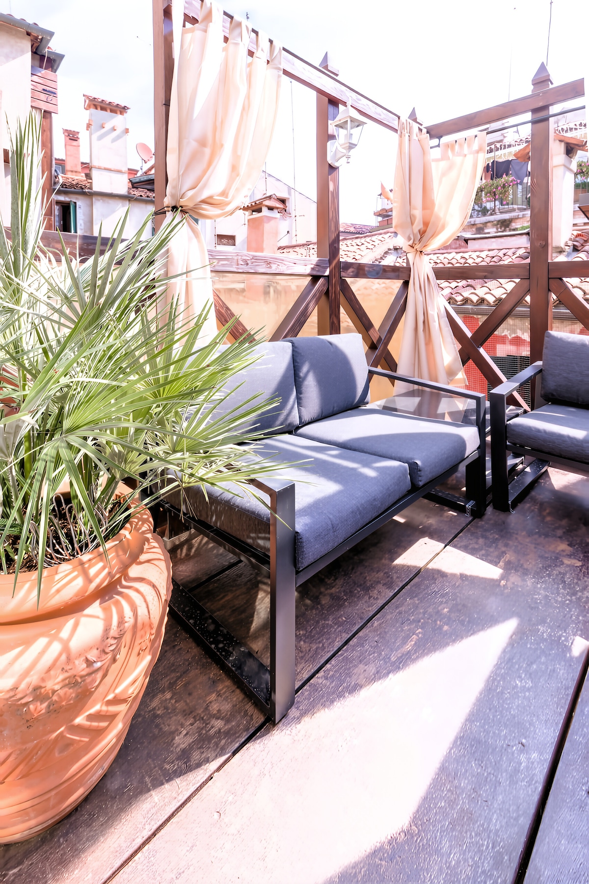Siamo nel cuore di Venezia, nel quartiere di San Polo, a due passi dal ponte di Rialto. L’appartamento è dotato di una comoda camera matrimoniale e di un divano letto matrimoniale nel soggiorno, e di due bagni, uno dei quali dispone di una sauna e di un idromassaggio, perfetti per coccolarvi e rigenerarvi in un ambiente di puro relax. Ma la vera perla della nostra casa è la splendida terrazza sul tetto, chiamata "altana" in veneziano, da cui si gode di una splendida vista sul Canal Grande.