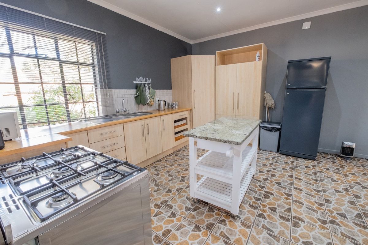Le logement indépendant meublé est spacieux et dispose d'une chambre avec un lit queen size, d'une salle de bain et d'un espace de vie séparé avec canapé, télévision et kitchenette. Un système solaire - pas de délestage ! Un lit de camping est disponible et un lit simple peut être installé sur demande moyennant des frais supplémentaires. Toutes les commodités nécessaires pour un court séjour. Il est situé à 400 m de l'Afridome et à 2 km de la rivière/la rue Breë où vous pourrez profiter de notre belle ville avec une variété de galeries, d'antiquaires et de restaurants.