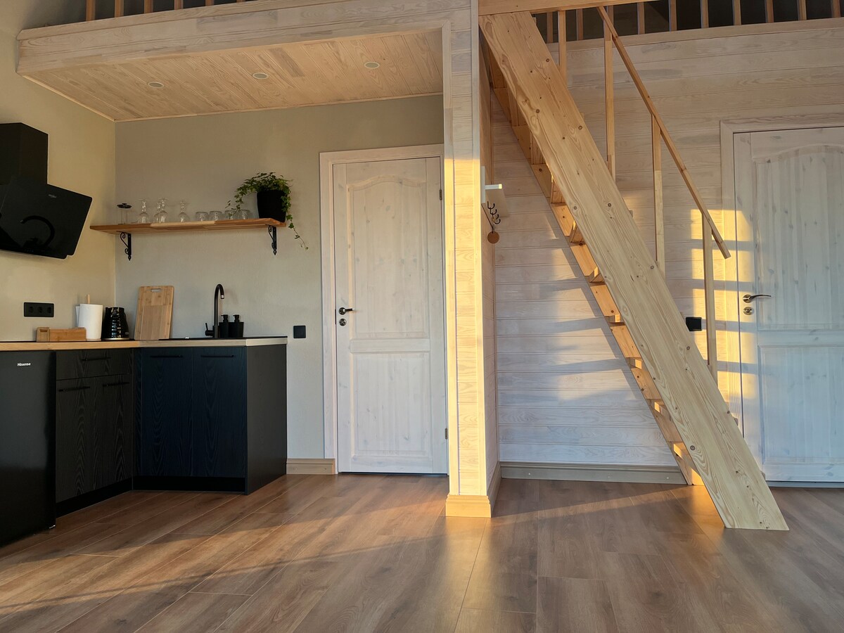 Belle et petite cabane pour deux. À côté de la rivière et à environ un kilomètre d'une belle plage. Bateaux à rames disponibles pour aller à la mer. 22 min en voiture de Ventspils. 40 min de Kuldīga ou Pāvilosta. Lieu idéal pour se détendre mais proche de la ville. Accès au terrain de tennis et de basket, terrain de basket. Sauna disponible.