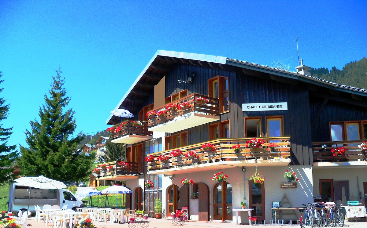 Bienvenue dans notre appartement Studio de caractère situé au rez-de-chaussée de notre pittoresque ferme savoyarde du 19e siècle, à proximité de la frontière Morzine/Montriond. À seulement 15 minutes à pied du centre du village de Morzine dans un sens et à 5/10 minutes de Montriond dans l'autre. Notre espace offre une retraite confortable avec des équipements modernes et une touche de charme historique, des beaux murs en pierre d'origine aux poutres en bois massif et à la porte d'entrée rustique fabriquée à la main.