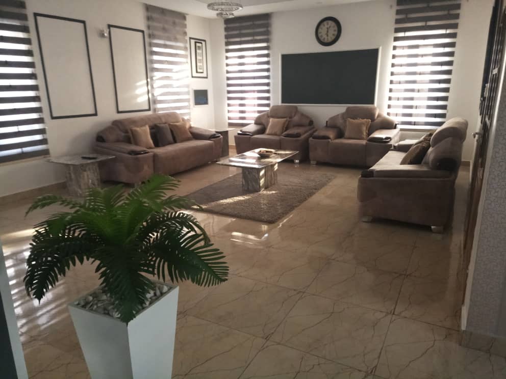 Maison contemporaine spacieuse de 4 chambres familiales avec une ambiance charmante dans un domaine desservi et sécurisé avec des attractions à proximité comme des supermarchés, des bars, des restaurants et un cinéma. La maison est entièrement meublée et équipée pour répondre à vos besoins avec : **Alimentation 24 heures sur 24 (avec onduleur de 10 kVA de secours) **Sécurité 24h/24 et 7j/7 **Salon et salle à manger beaux et confortables. **2 balcons sur 2 étages **Cuisine équipée **Netflix et DSTV (télévision par câble) **Ménage de la maison. **Internet rapide (Internet par fibre optique)