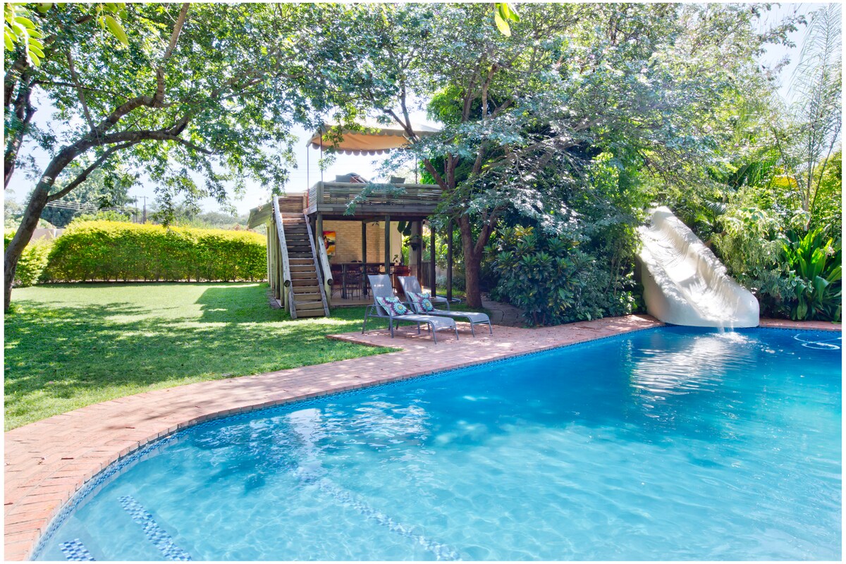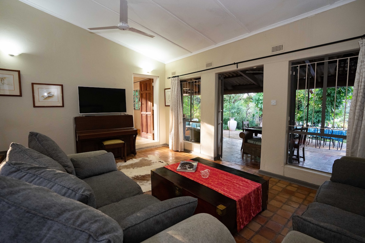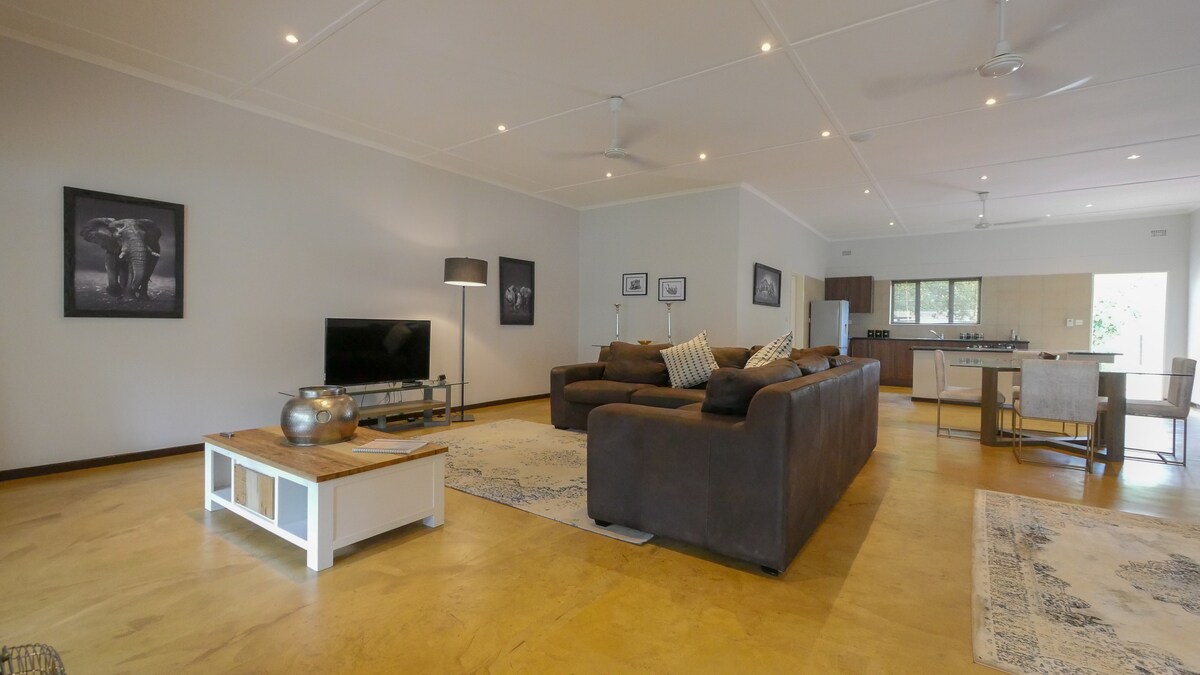 Belle maison de 5 chambres au cœur de Victoria Falls, située dans une banlieue verdoyante et calme. Cette propriété est équipée de tous les équipements dont vous avez besoin pour une expérience d'hébergement incroyable, une grande cuisine, une piscine et un espace de divertissement. Aj et Jess, vos hôtes, sont là pour s'occuper de tout ce dont vous avez besoin et peuvent facilement organiser le transport et les activités. La restauration peut être incluse si vous ne voulez pas penser à cuisiner.