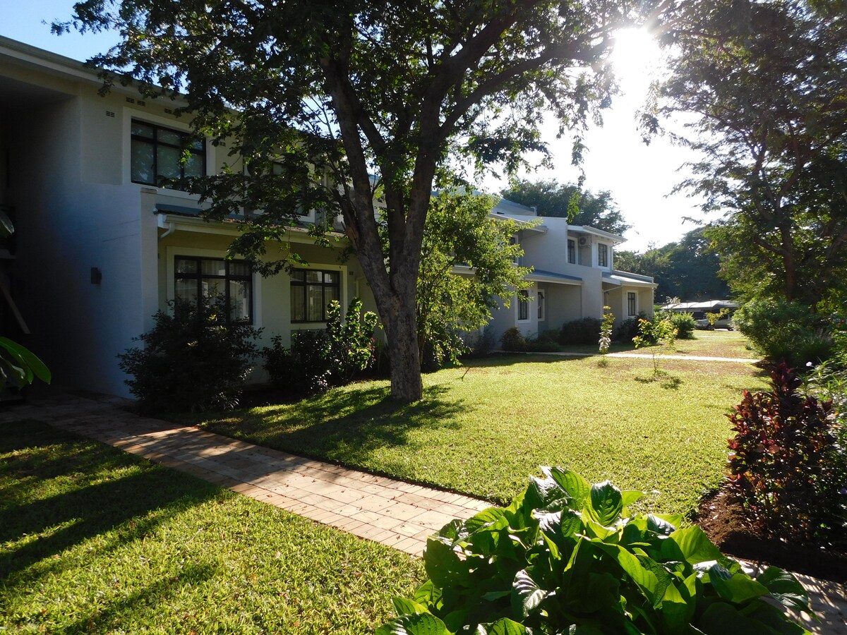 Détendez-vous dans un élégant cottage de 2 chambres avec salle de bains sous des tecks ombragés sur une route tranquille à quelques minutes de la ville de Victoria Falls. Profitez du confort et de l'intimité avec une piscine, un jardin luxuriant et une véranda spacieuse, idéale pour le café du matin et les boissons au coucher du soleil. À l'intérieur, vous trouverez des chambres climatisées, le Wi-Fi, Netflix, un espace de vie généreux et une cuisine entièrement équipée. Parfait pour l'aventure, la romance ou une escapade en famille, proche de la nature et proche de l'action.