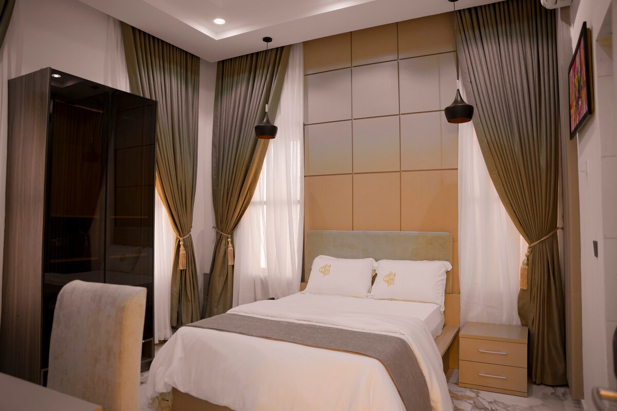 Experience luxury at this stylish Lagos retreat! Featuring a plush king-size bed, chic parlor, smart TV, high-speed Wi-Fi, and air conditioning, this suite blends comfort and sophistication. Nestled in a vibrant, upscale neighborhood near top dining and nightlife, it’s perfect for business or leisure. Enjoy premium amenities, elegant design, and a true 5-star experience in the heart of Lagos.