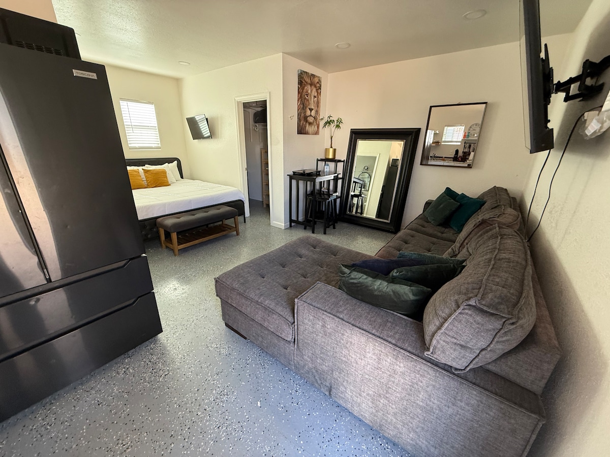 Studio avec entrée privée. Un lit King Size. Peut accueillir jusqu’à 3 personnes (ou 4 si l’une d’entre elles dort dans le canapé). Vous aurez un grand espace juste pour vous. Vous avez votre propre climatisation, télévision avec Amazon Prime avec de nombreux films gratuits. Vous disposez d'une kitchenette avec des appareils électroménagers de base et d'un réfrigérateur de grande taille. Vous apprécierez la salle de bain avec douche, lavabo et serviettes très douces ainsi que le savon et le shampoing avec après-shampoing de taille hôtelière.
