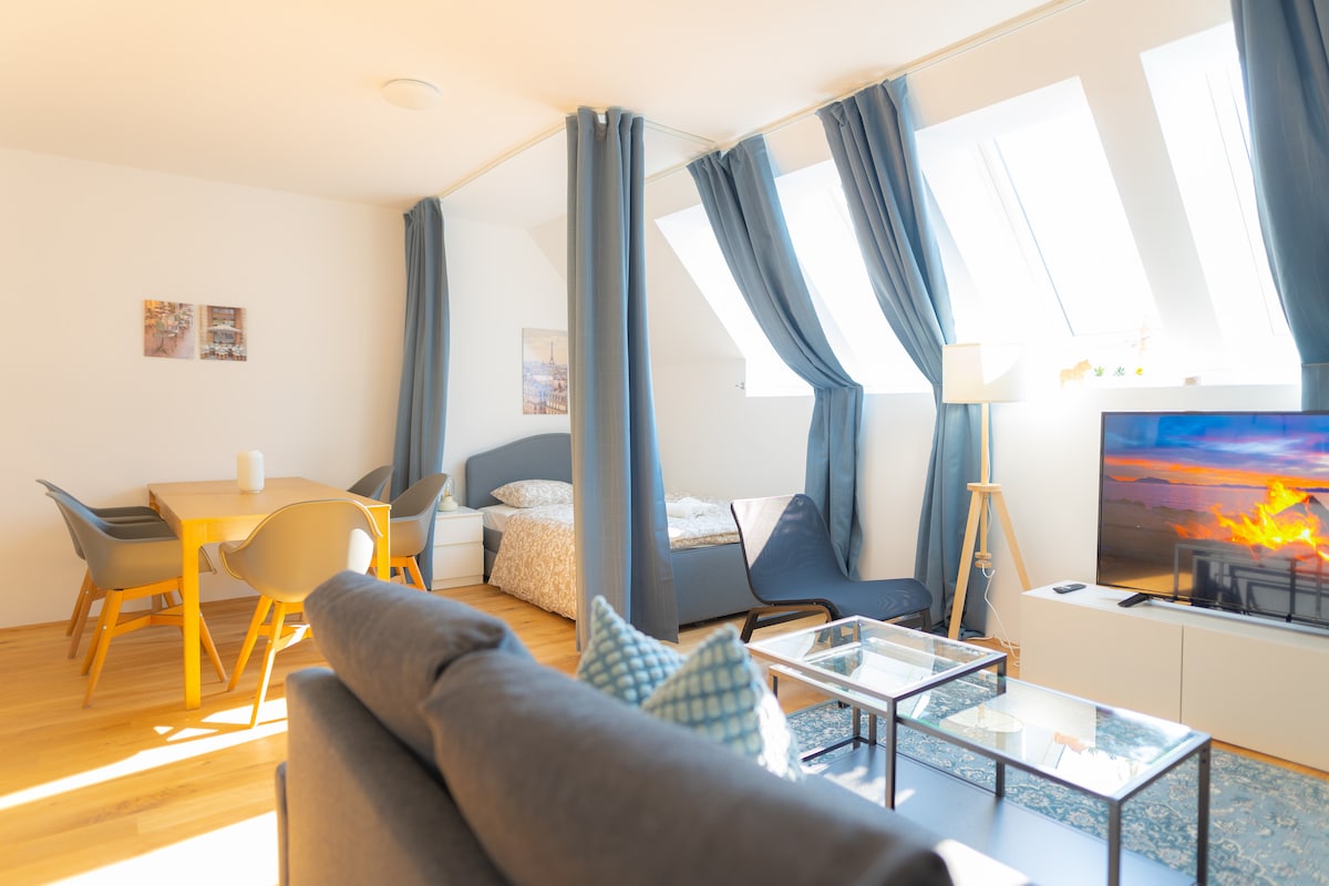 Bienvenue dans mon appartement conçu avec amour et officiellement enregistré. Vous pourrez vous détendre et travailler au cœur de designs chics et confortables. C'est l'endroit idéal pour les familles, les affaires et les couples pour découvrir la belle Vienne. L'appartement dispose d'espaces de vie éclairés, d'une cuisine entièrement équipée et d'un petit patio extérieur, d'un sauna infrarouge, d'une connexion wifi haut débit, d'une télévision connectée et d'un lieu de travail. Le centre-ville, les rues commerçantes, les transports et les restaurants sont à proximité immédiate.