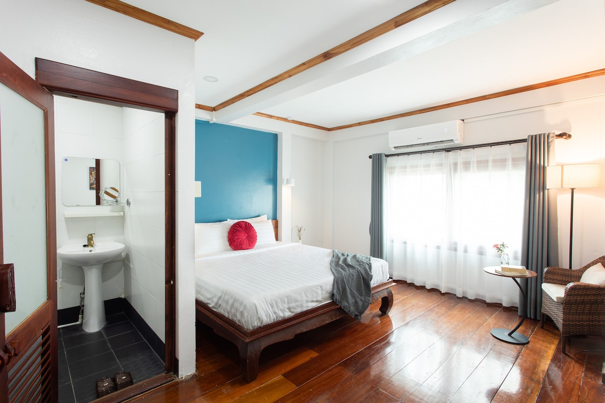 Nouvellement ouvert - confortable et abordable BlueHome est une base paisible dans une rue calme au cœur de Vientiane. Chaque détail, du matelas et des draps aux équipements pratiques, est mis en place pour un véritable repos entre les voyages. À deux pas du Mékong, du marché nocturne, des cafés et des temples, mais à l'abri du bruit. Idéal si vous voyagez entre Pakse, Thakhek, Vang Vieng, Luang Prabang ou Nong Khiaw, ou si vous visitez l'ambassade de Thaïlande, avec une laverie gratuite et une connexion Wi-Fi rapide pour vous reposer et vous sentir comme chez vous.