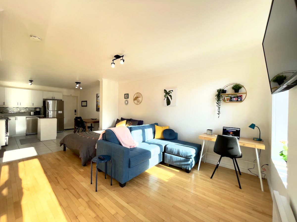 Studio mignon et confortable fraîchement rénové. Cuisine équipée, espace repas pour 2, canapé double profondeur pour regarder des films sur l'écran de la télévision, lit queen size, douche (hauteur de 6’6’ ’/2m max)… etc. Tout pour faire de notre appartement votre base pendant que vous explorez tout ce que la ville de Québec peut offrir.