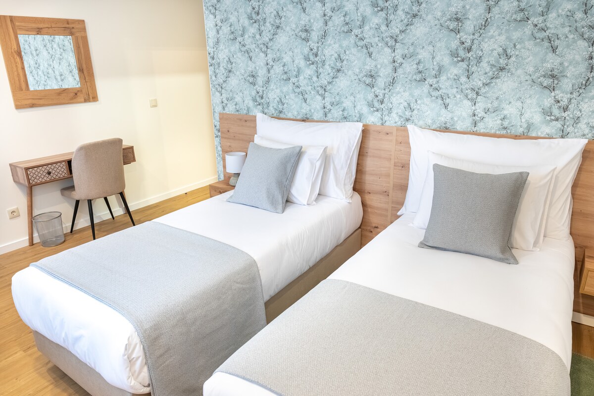 Cette chambre avec lits jumeaux offre le confort de deux lits simples et d'une salle de bains privée, assurant intimité et commodité pendant votre séjour à la Casa Dona Edite. En outre, profitez d'une vue imprenable sur la vallée du Douro, offrant une atmosphère paisible et inspirante à nos voyageurs. La piscine est pour tout le monde à la maison d'hôtes.