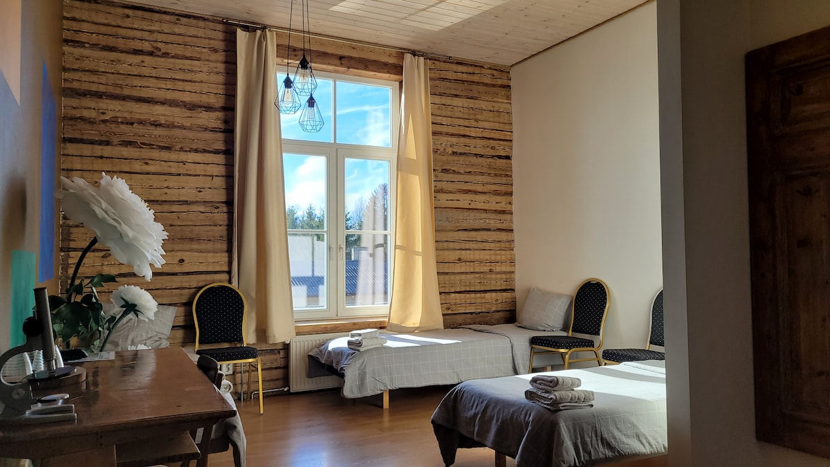 Il y a des frais de 5 € par jour pour un animal La chambre triple Carl Schmidt House Economy (18 m ²) est le choix idéal pour un hébergement abordable La chambre dispose de 3 lits simples, d'un parquet stratifié, d'une télévision, d'une connexion Wi-Fi gratuite, d'un radiateur, d'une penderie, de serviettes et de draps. La chambre dispose de prises électriques près du lit et de 2 douches/toilettes partagées dans le couloir La chambre est située dans le centre de Põltsamaa, offrant un emplacement idéal pour séjourner, se détendre et explorer la ville. * Uniquement des escaliers pour accéder aux étages supérieurs