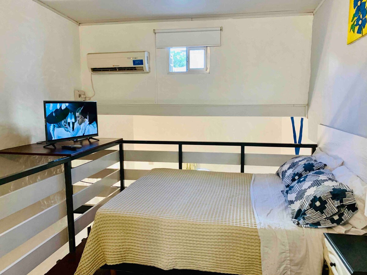Le Loft fait partie d'une maison avec des jardins avec des plantes et des fauteuils pour se reposer dans les patios. La sécurité est optimale. Bien qu'il soit proche de 2 avenues importantes, il est loin du bruit de la grande ville. Il dispose de toutes les commodités nécessaires pour des séjours agréables. C'est une rue très calme de maisons avec très peu de circulation, vous pouvez donc vous reposer en toute tranquillité. Il est situé à 400 mètres de la station de métro Malabia B et à 400 mètres du stade Movistar Arena.