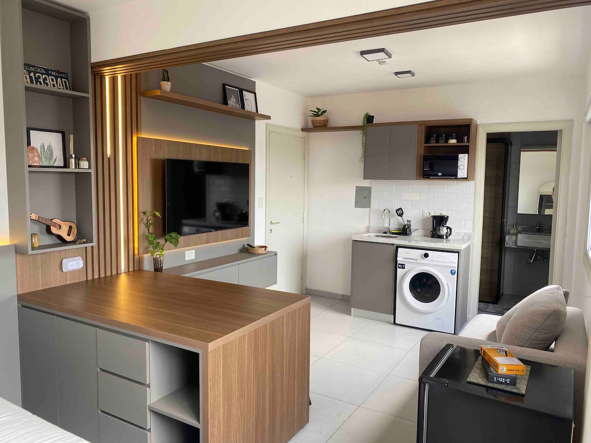Appartement neuf dans immeuble luxueux. Il dispose de 40 m², avec Smart TV, WIFI, et dans le bâtiment vous avez toutes les commodités : piscine, kiosque climatisé avec barbecue, salle de jeux pour enfants, salle de sport équipée, etc. Il est à 5 minutes en voiture du centre d'entreprise le plus apprécié de la capitale, et à 25 minutes à pied. Il est également à 11 minutes en voiture de l'aéroport Silvio Pettirossi Il dispose d'un lit double + un canapé-lit. Au total, jusqu'à 3 personnes peuvent dormir.