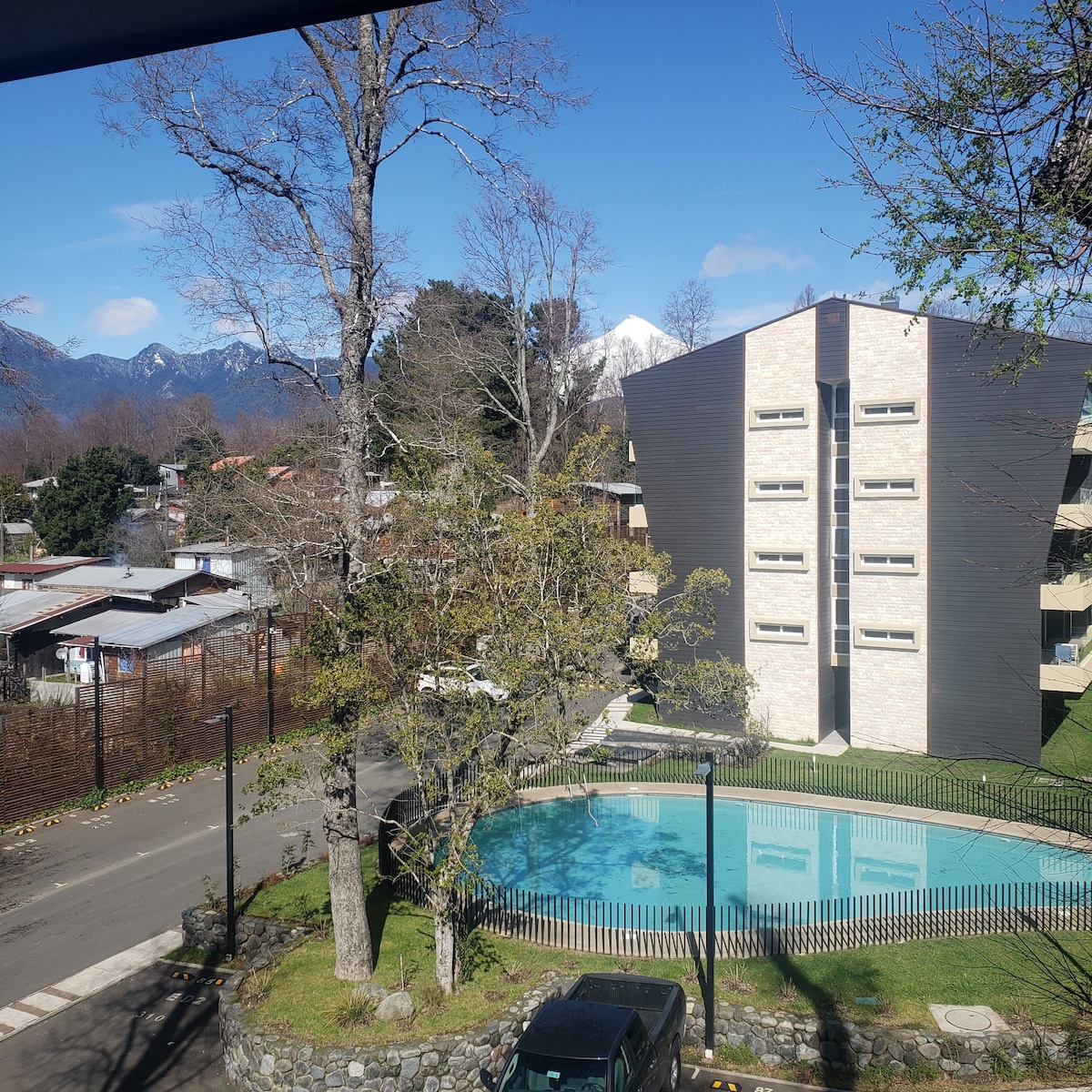 Appartement studio près du centre. Entièrement meublé, avec des fenêtres en thermopanneau et vue sur le volcan. L'appartement comprend : Lit double Cuisine américaine aménagée Grande terrasse équipée Grill électrique Chauffage électrique Parking privatif *Désinfecté avec de l'ammonium quaternaire. Autres services : piscine extérieure, salle de sport, sauna, salle de jeux, quincho et laverie.