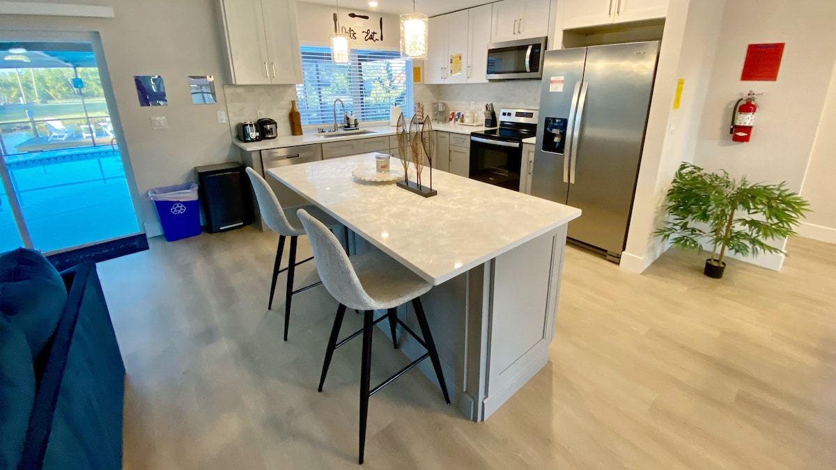 Welcome to our 3 bed/2 bath waterfront Gulf Gateway in Fort Myers, FL! Nestled off the open waters of the Gulf of Mexico, our modern home offers a symphony of luxury & leisure. Splash into our sprawling pool, sizzle up delights in the Grill-n-Chill lounge, reel in memories off the fishing dock, drift into bliss on our charming pedal boat or bring out your competitive side with a friendly game of billiards & foosball, there is something for every family member to enjoy at our resort-like oasis!