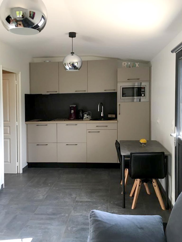 La maison se situe dans une propriété en face de notre logement. Elle dispose d'une terrasse. La maison de 30m2 offre : - une pièce à vivre avec une cuisine équipée ouverte. - une salle de douche avec WC séparé. - une chambre avec deux lits simples pouvant être réunis en un lit double. Elle est équipée d'un lave-linge, lave-vaisselle, de chauffage et climatisation, ainsi que d'une cafetière Senseo®.