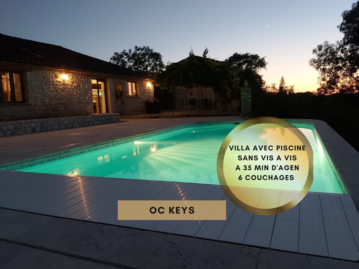 Maison au coeur du Lot et Garonne et à proximité du"Périgord pourpre".Territoire d'agriculture, d'histoire et de gastronomie où il fait bon vivre.Venez profiter de notre hébergement, maison récente avec vue sur la champagne.Elle possède climatisation , chauffage dans chaque pièce, grand séjour avec poêle à bois, une cuisine équipée,3 chambres une avec un lit en 160, terrasses et un grand jardin . Il est possible de pêcher sur un lac privé situé à 400 mètres et aussi au lac du Lourbet à 2km .