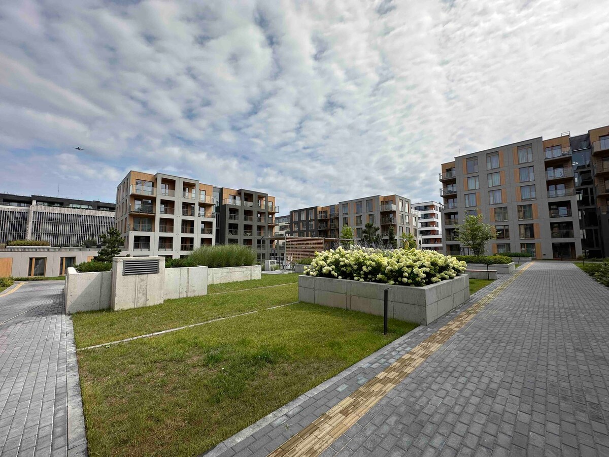 Cet appartement est à distance de marche de la gare et à proximité de la vieille ville. C'est un appartement lumineux et spacieux dans une maison neuve, avec une chambre séparée et un studio de cuisine et un grand balcon. Le trajet jusqu' à l'aéroport prendra de 7 à 10 minutes. La cuisine est équipée de tout le nécessaire pour un long séjour, nous fournissons également un lit bébé supplémentaire -mange. La chambre dispose d'un lit double. Canapé.