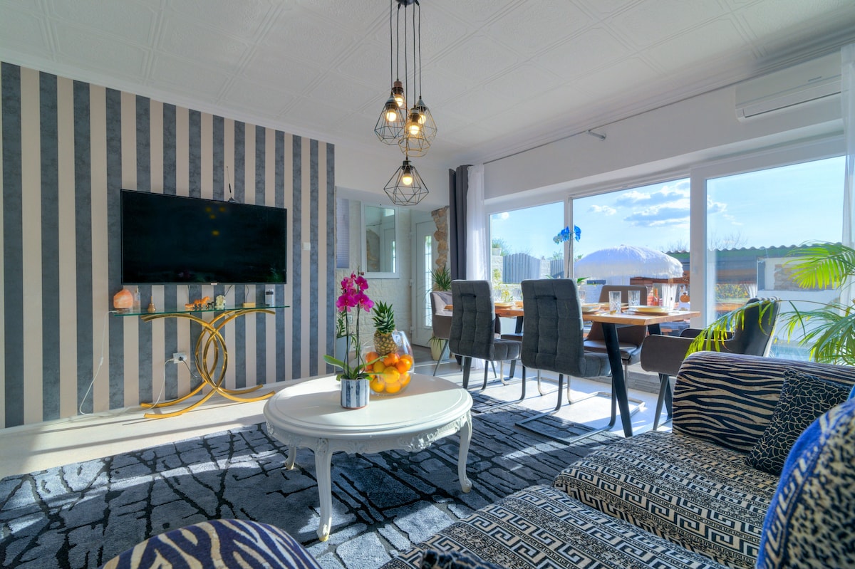 Entourez-vous du turquoise de votre piscine privée tout en admirant le bleu profond de la Méditerranée. ☞ Télévision OLED Ambilight 43 pouces ☞ Salle de bain élégante avec douche de luxe ☞ Barbecue en plein air ☞ Machine à café Nespresso Vertu ☞ Wi-Fi rapide 500 Mb/s ☞ Piscine à débordement avec entrée de plage et revêtement en galets ☞ Espace repas extérieur ☞ Salon de luxe ☞ À 15 min à pied de la plage et de la ville ☞ L'éclairage LED extérieur unique crée une ambiance spéciale la nuit Envoyez-nous un message, nous serions ravis d'avoir de vos nouvelles !