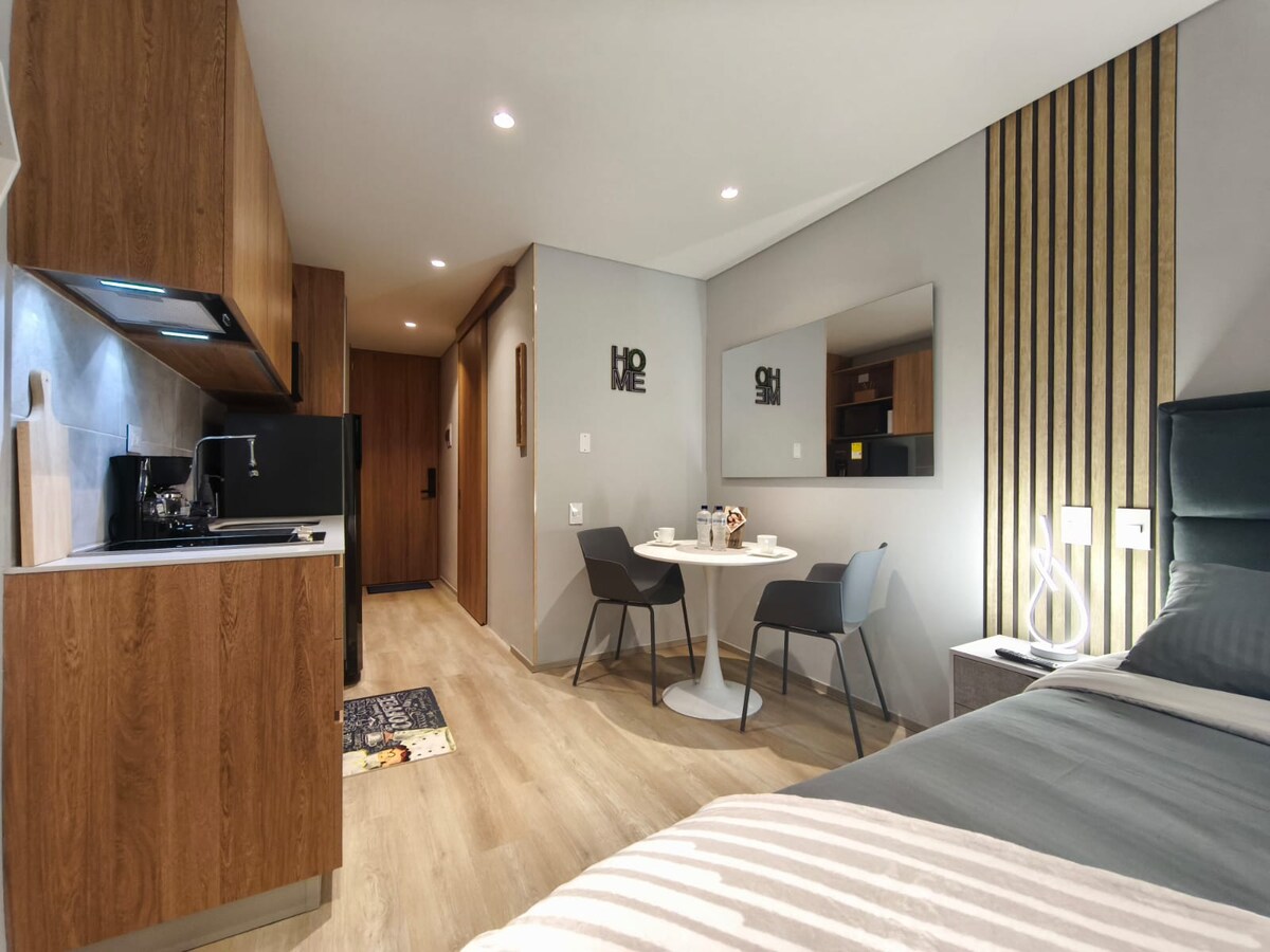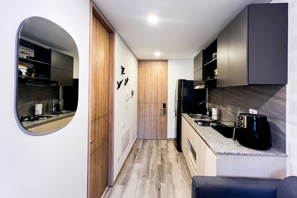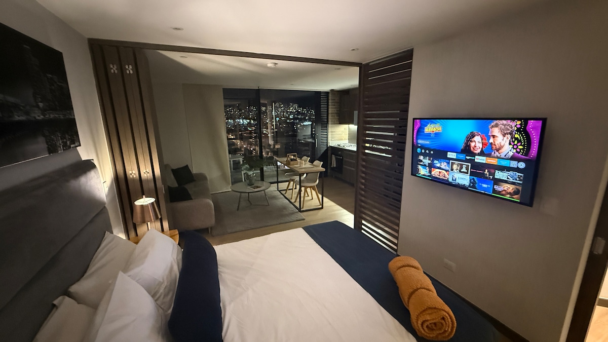 Profitez d'un loft premium au cœur de Chicó Un espace moderne de 27 m² avec balcon privé, lit de luxe, draps extra doux, rideaux motorisés, miroir avec Bluetooth et lumières LED de dernière technologie. Idéal pour les longs séjours : il dispose d'un bureau ergonomique, d'une connexion Wi-Fi 5G et d'une télévision intelligente avec Netflix, Disney+ et Prime Video. Comprend une machine à laver propre et une option de nettoyage hebdomadaire avec changement de linge. Vivez Bogotá avec style et confort.