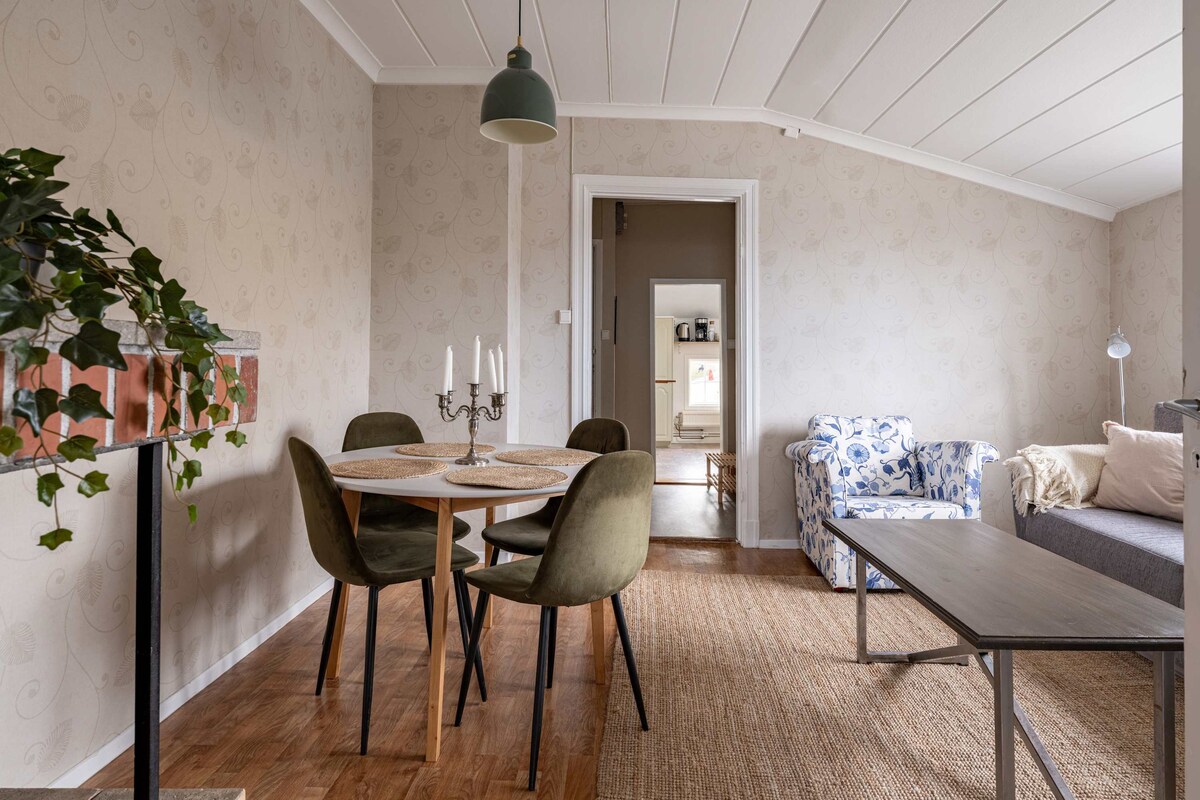 Maison typiquement suédoise en bois rouge du début du XXe siècle, entièrement rénovée à un niveau moderne. Deux chambres dans le grenier sont accessibles par un escalier raide. En bas se trouve un salon avec deux canapés (dont l'un est un canapé lit) et un fauteuil à bascule. Télévision, Chromecast et cheminée. Cuisine avec réfrigérateur et un petit congélateur, une cuisinière à gaz, un four, un micro four et une cheminée. Salle à manger pouvant accueillir 8 personnes maximum. Grand jardin de 5000 m2 avec sauna.