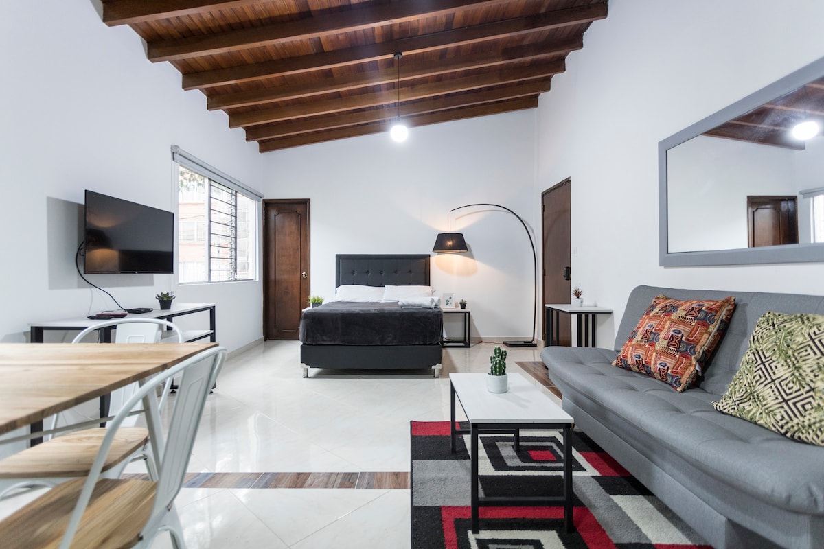 - Emplacement privilégié : au cœur du quartier Laureles, à proximité des stations de métro, du stade, des supermarchés, des restaurants et de la 70. - Excellent balcon avec vue sur la ville. - Wifi (300 Mb) Fibre optique. - A/C - Jacuzzi privé - Personnel sur place 24 h/24 et 7 j/7, prêt à vous aider pour tout ce dont vous pourriez avoir besoin. - Télévision intelligente 43”, avec des applications installées. - Cuisine équipée avec vaisselle, casseroles, cuillères, couteaux. - Lit queen size (1,60 m x 1,90 m) - Prix transparents (voir règles)