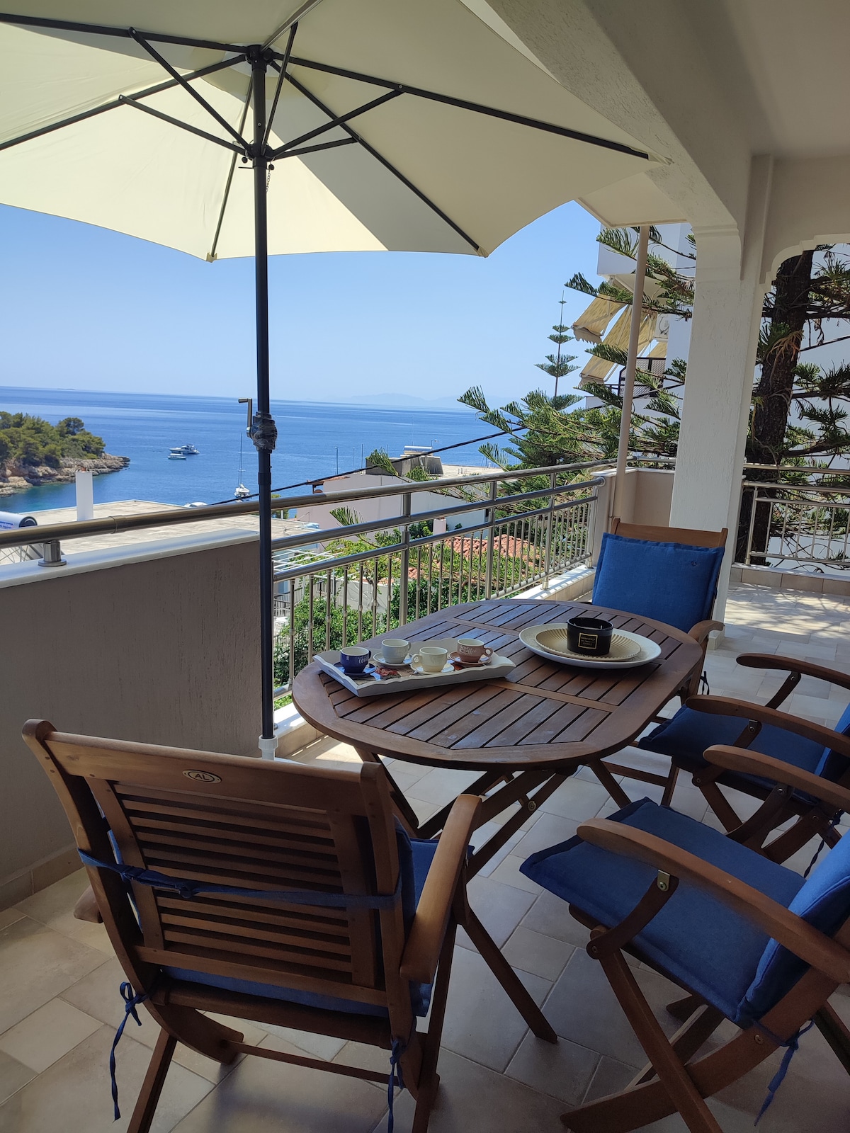 Second floor two-bedroom apartment ( 65 sq.m.) on the waterfront in very quiet location in Loutraki, Skopelos Island. The road outside is a cul-de-sac leading only to the footpath beach. Air conditioning in kitchen/diner and main bedroom. The apartment has a square balcony large enough to dine outside, stunning views overlooking the pretty little harbour of Loutraki, and only 3 minutes walk from the closest beach.