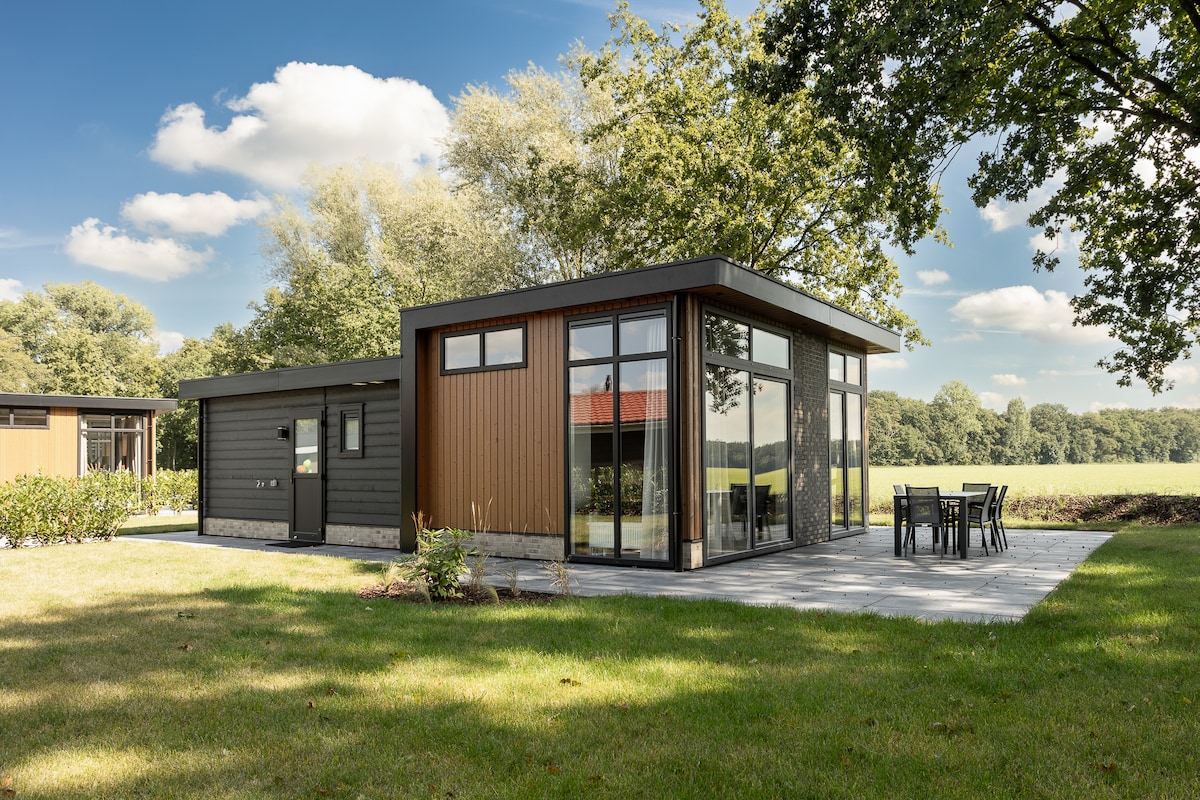 Un chalet en pierre indépendant avec un jardin privé et une vue sur le paysage pittoresque d'Achterhoek. En raison des nombreuses fenêtres, le salon est très lumineux et spacieux. Il y a également un poêle à bois vous permettant de vous réchauffer près du poêle les soirs froids et bien sûr dans le sauna. Nos chevaux se promènent dans la prairie devant le jardin, nos poules courent également en liberté dans le jardin.