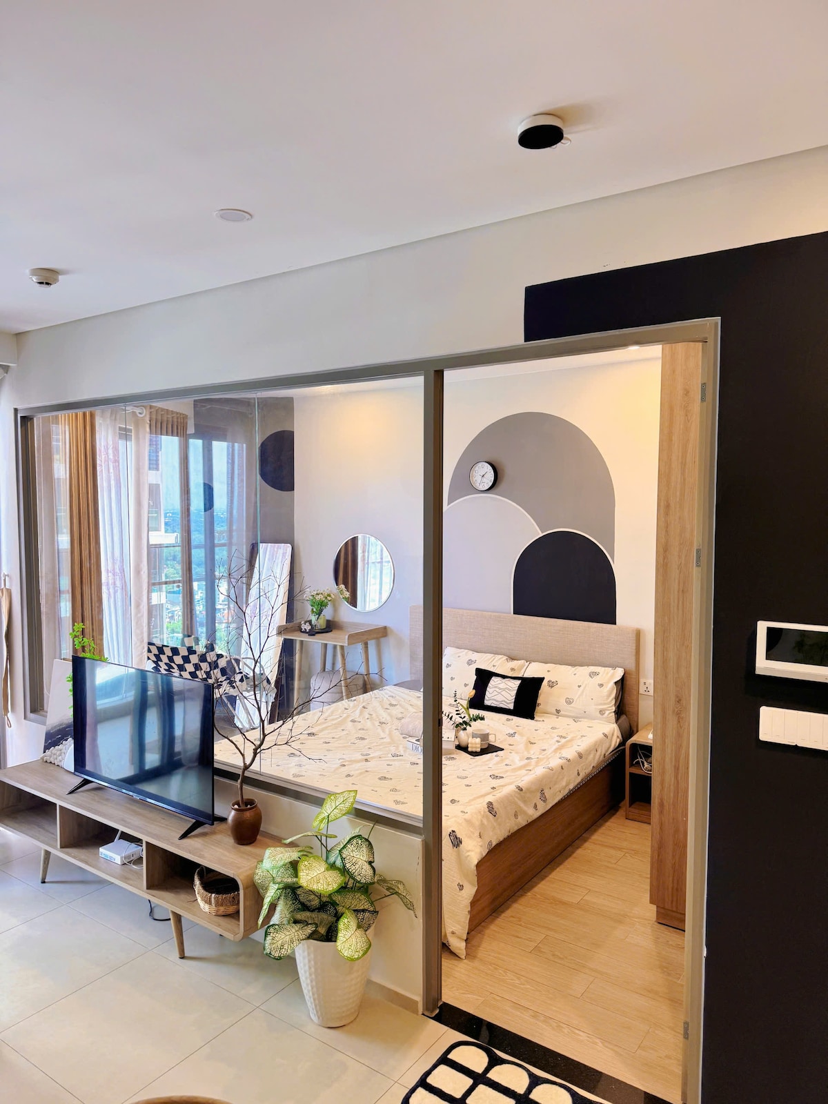 Notre appartement dispose d'un salon, d'un coin repas, d'une chambre (1 lit double et canapé-lit), d'une salle de bains et d'un balcon. - La chambre : notre vue depuis la chambre est romantique avec la vue sur la grande colline scintillante. Nous fournissons un climatiseur, un couvre-lit et un traversin. - Cuisine : les installations nécessaires sont fournies pour cuisiner un délicieux repas. - Balcon : balcon spacieux avec un ensemble de 2 chaises en rotin et 1 table, où les voyageurs peuvent se détendre et profiter de la vue imprenable sur la mer bleue avec un délicieux repas.