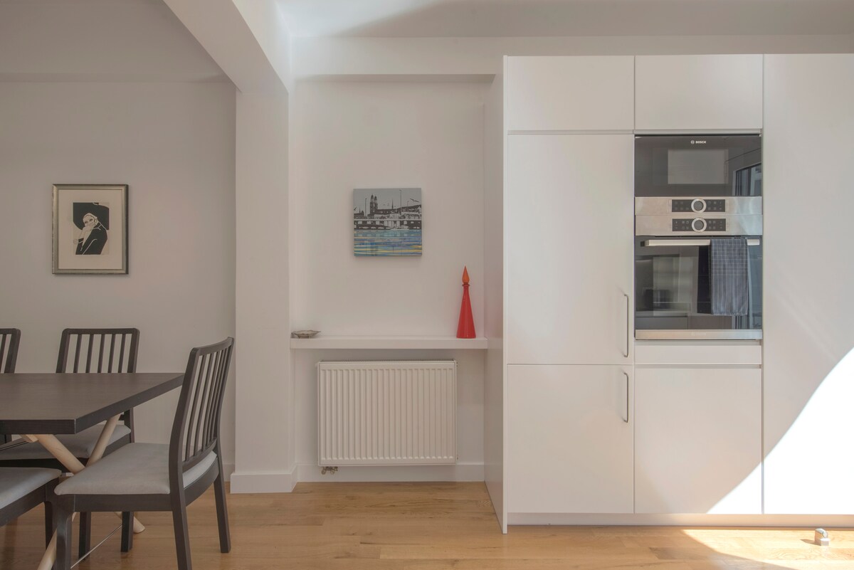 Bel appartement neuf de 2 chambres et 2 salles de bains (une en suite), beaucoup de lumière naturelle et de hauts plafonds, des espaces de vie spacieux, des balcons dans toutes les chambres, des moustiquaires, au troisième étage (ascenseur). Quartier central recherché du quartier branché de Pagrati, à quelques minutes à pied du centre et des principaux sites et commodités, accessible à pied depuis le métro (ligne directe de l'aéroport). Meublé avec goût et décoré avec des œuvres d'art originales, chauffage central indépendant et climatisation pour un confort toute l'année, télévision par câble et Netflix. Comme chez vous !