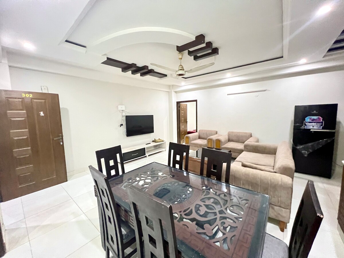 🏡 Bienvenue à THE FOUR - Appartement familial de 3 chambres 🛏️ Lits confortables et chambres spacieuses Salon 🛋️ relaxant et cuisine moderne 🚿 Salles de bain modernes et propres Arrivée 🔐 autonome avec serrure connectée Wifi 📶 haute vitesse Mini-bar 🧃 gratuit 🚿 Eau chaude 24h/24 et 7j/7 Situé dans une résidence sécurisée et fermée, à seulement 10 minutes de tous les principaux sites d'Islamabad. Cet appartement entièrement meublé est parfait pour les familles à la recherche de confort et de commodité à Isb. Une pièce d'identité avec photo/CNIC du voyageur sera demandée après confirmation.