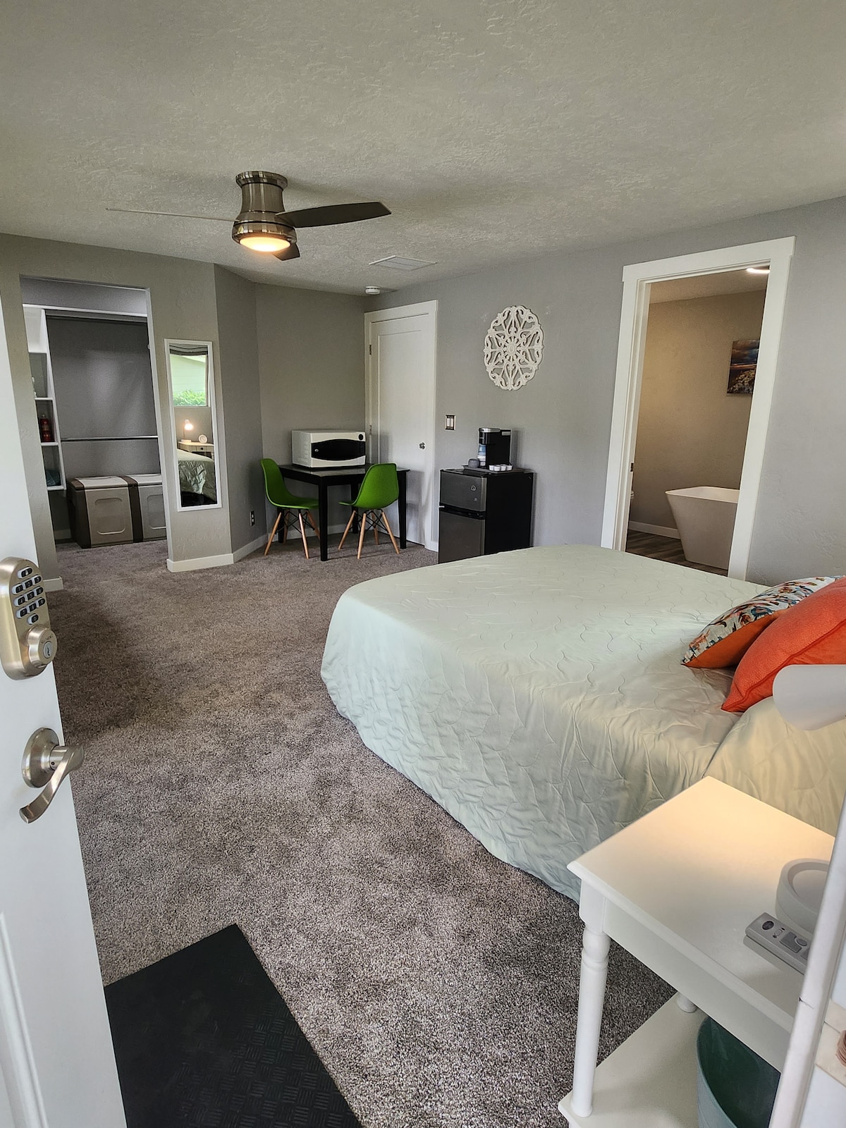 Welcome to Studio 208—more than just a place to rest your head. Immerse yourself in this private retreat, featuring European-inspired architecture, a modern spiral staircase, and an artistic slat-wood accent wall. The full tile shower and minimalist design create a calm, creative atmosphere perfect for relaxation or inspiration. Located In the heart of Meridian, you’re close to all the dining and entertainment the valley has to offer—enjoy a stay that leaves you refreshed and eager to return✨