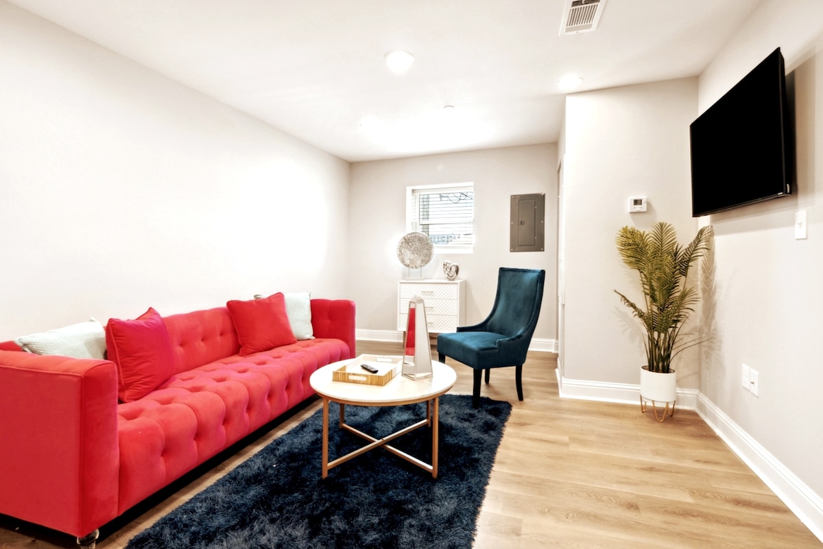 Profitez d'un appartement privé avec sa propre kitchenette et son salon à l'Empire Lounge. La chambre dispose d'une salle de bain attenante et d'un lit king size. À seulement 1/2 mile du Superdome et du Smoothie King Arenas ! Il y a une télévision connectée murale dans la chambre ! Veuillez noter qu'il y a une salle de concert attenante connue pour accueillir des concerts et des événements locaux. Il y a un risque de nuisances sonores dans la suite, ainsi qu'une sécurité armée pour les événements de plus de 500 personnes. Les voyageurs ont accès au parking privé.