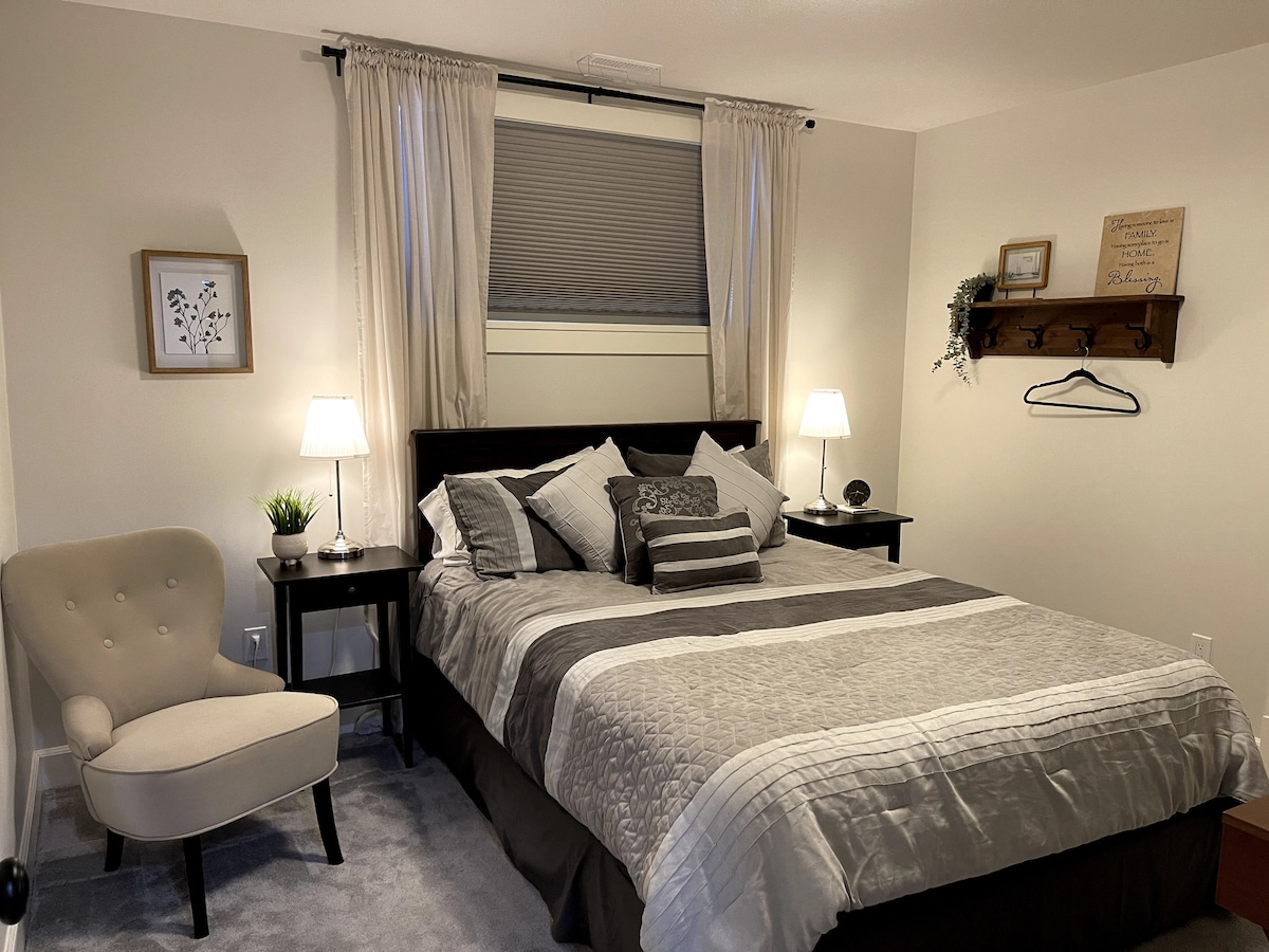 Détendez-vous dans ce bel espace avec un lit Queen Size confortable, un fauteuil, un bureau pour travailler et une télévision pour regarder Netflix. Si vous séjournez plus d'une nuit, vous pouvez utiliser la buanderie. Votre salle de bains privée est équipée d'une baignoire/douche et de tous les draps. Cette chambre lumineuse au sous-sol se trouve dans une maison plus récente, où nous ne sommes que deux à vivre. Pas d'animaux de compagnie. Interdiction de fumer dans ou sur les lieux. Pas d'alcool s'il vous plaît. À distance de marche des terrains de baseball, du théâtre et de l'arène. Court trajet en voiture du terrain de golf.