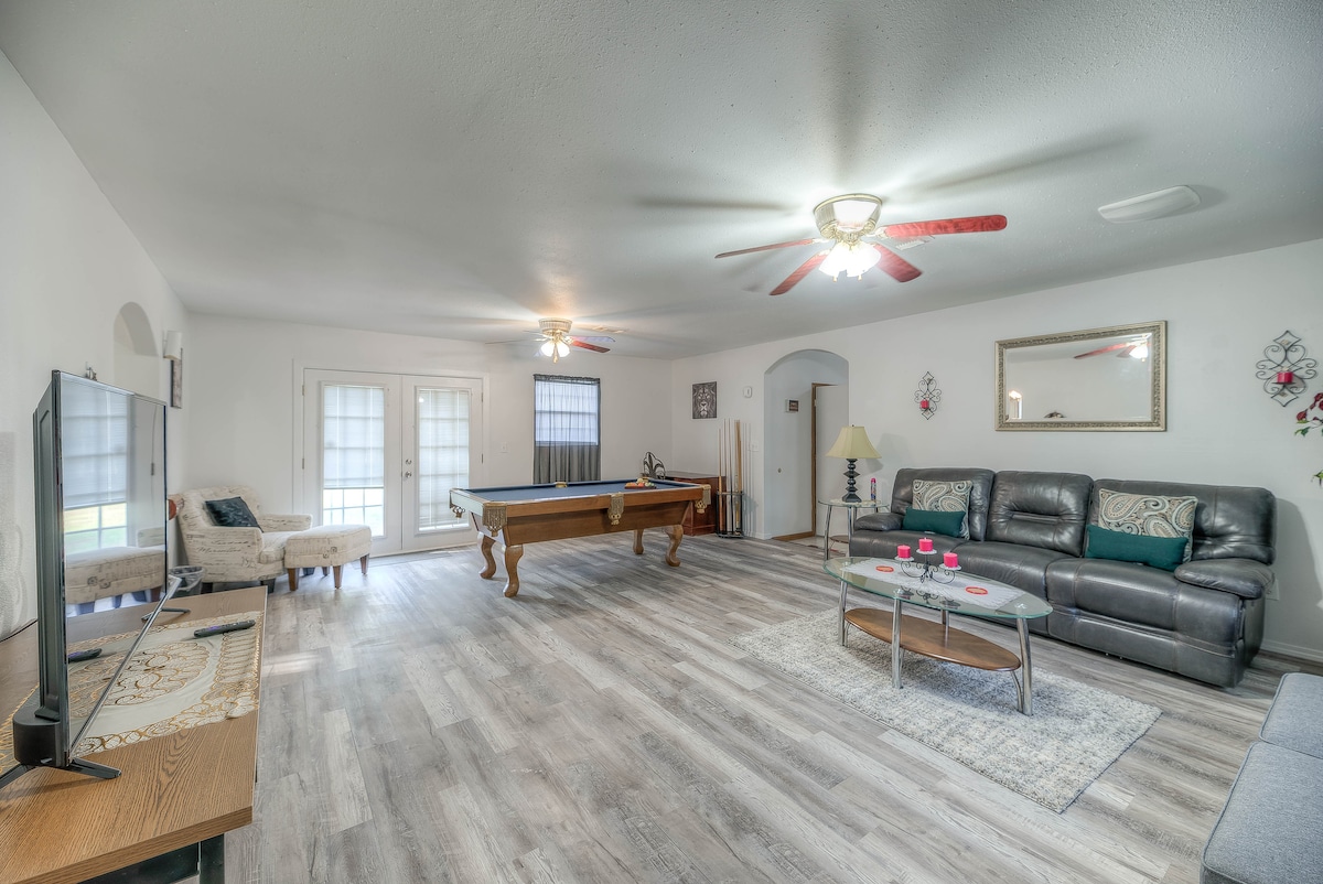 Détendez-vous en famille dans ce logement paisible situé sur un terrain de 3 acres. Prenez votre café du matin sur le porche arrière et regardez le soleil se lever. Profitez du coucher de soleil sur le porche. Les événements sont les bienvenus, mais un préavis et des prix supplémentaires seront facturés. Veuillez envoyer des demandes d'information à l'hôte avant de réserver.