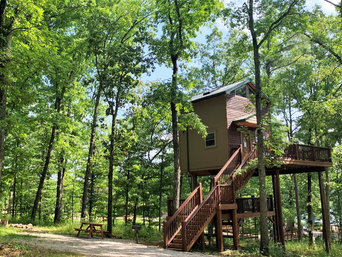 Newly Updated** Enjoy the lovely setting of this romantic spot in nature, with a semi-primitive, modern cozy secluded treehouse in the woods! Explore 10 acres or wind down on the deck before relaxing in the *NEW* hot tub. The cabin inside has a very minimalistic design featuring on the first floor an electric fireplace, air conditioner, table, refrigerator, leather futon couch, kitchenette with a hand crank water pump sink, axe throwing and porta-potty bathroom.