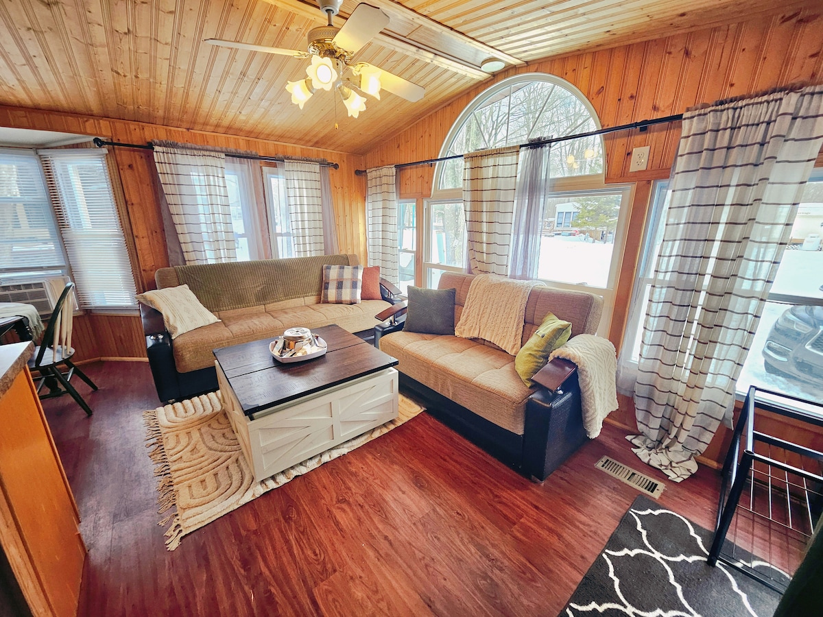 Chalet de 2 chambres/1 salle de bain récemment rénové pouvant accueillir 4 personnes. La cuisine est entièrement équipée, y compris four, cuisinière, réfrigérateur, micro-ondes, cafetière/kcups et grille-pain. Le chalet se trouve sur un terrain de 0,50 acre avec un foyer et des sièges adirondack parfaits pour une soirée de smores. Le lac Wallenpaupack est à 2 minutes à pied du chalet. La Communauté a des droits de lac, avec sa propre plage privée et l'accès au lac, que le voyageur sera invité à utiliser. Restaurants, stations de ski et locations de bateaux à proximité.