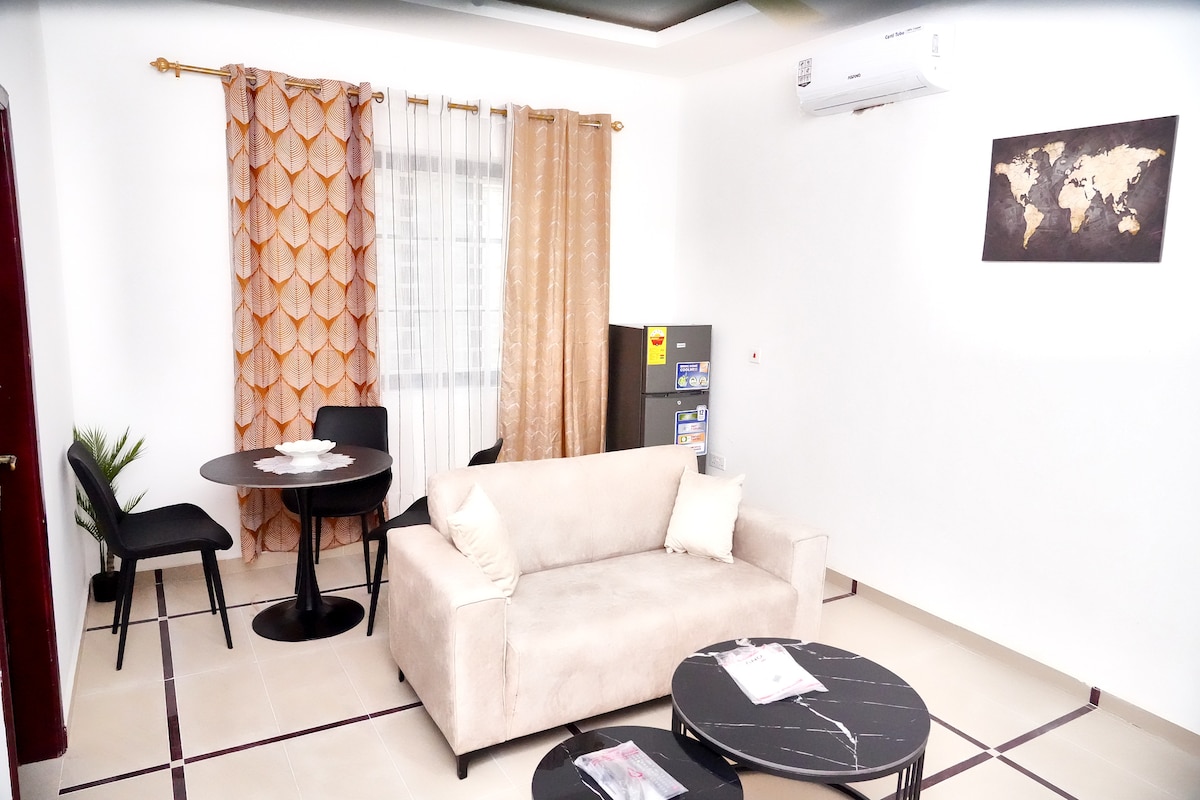Séjournez au cœur d'Accra dans notre charmant studio à Dansoman avec services de location de voitures. L'espace moderne et compact dispose d'un lit king-size confortable, d'une cuisine bien équipée et de fenêtres pour la lumière naturelle. Dégustez un café le matin avant de partir explorer la ville en toute simplicité en utilisant les transports en commun à proximité. Plongez dans la culture locale en vous promenant jusqu'aux magasins et restaurants à proximité. Parfait pour les voyageurs d'affaires ou de loisirs, notre studio offre une connexion Wi-Fi haut débit.