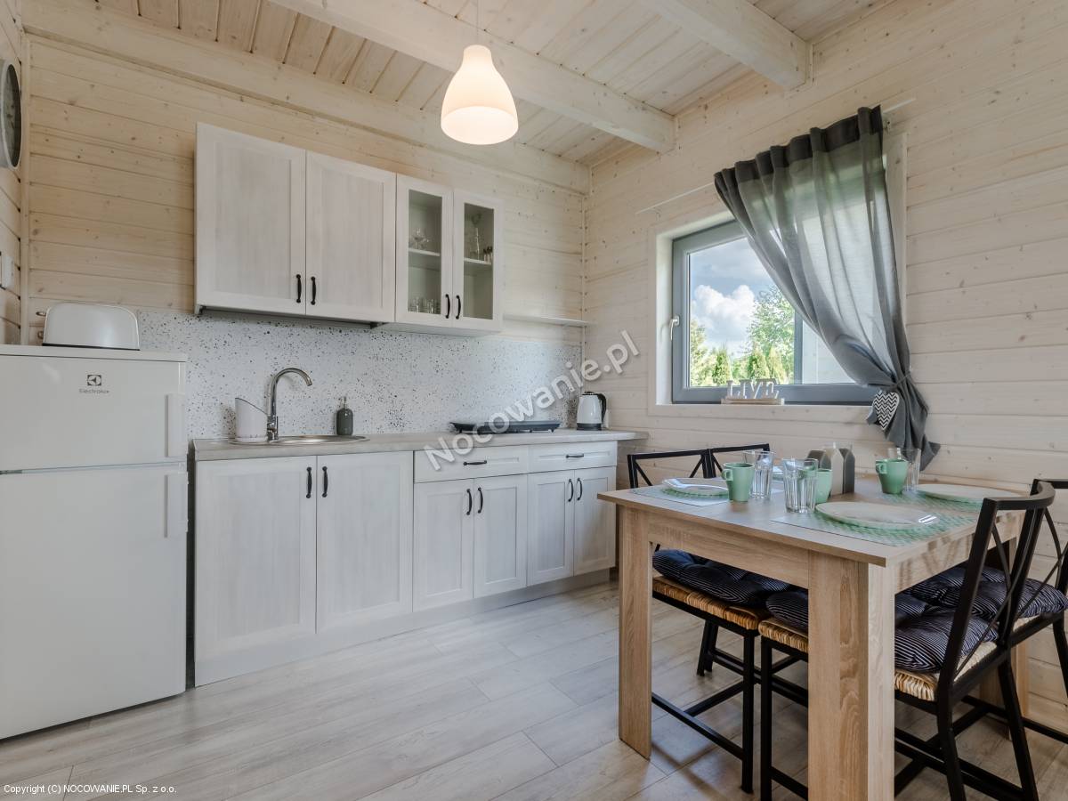 Domek letniskowy w Kopalinie z dwoma dwuosobowymi sypialniami na poddaszu. Jedna sypialnia z łóżkiem dwuosobowym, natomiast w drugim pokoju znajdują się dwa łóżka pojedyncze. Na parterze przestronna łazienka oraz salon z całkowicie wyposażonym aneksem kuchennym (lodówka, płyta indukcyjna, mikrofalówka, toster, garnki, naczynia i sztućce). W salonie znajduje się rozkładana kanapa, kominek na drewno oraz telewizor.