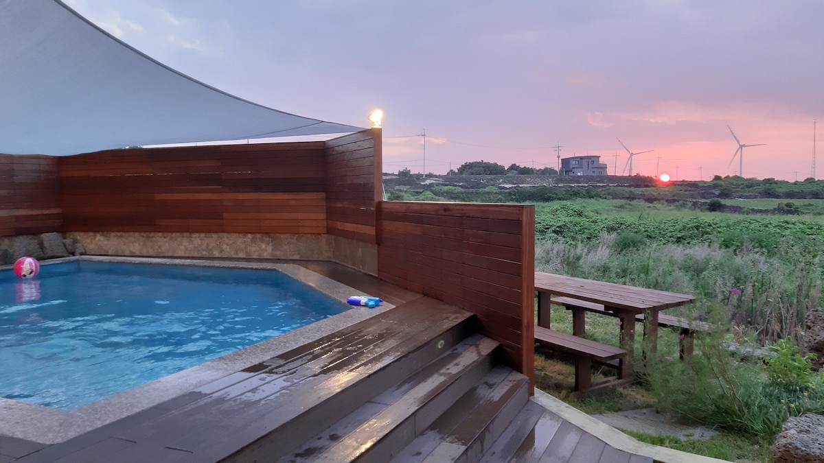 Il est situé à l'est de l'île de Jeju. C'est Haengwon-ri, proche de la célèbre plage de Woljeong. L'extérieur est entouré de murs de pierre. C'est un hébergement confortable et confortable avec un confort moderne. C'est calme devant la fenêtre et vous pouvez admirer la campagne de l'île de Jeju. Avec la nature unique et le calme de l'île de Jeju C'est le logement parfait pour se détendre seul avec des amis et des amoureux. Il y a une petite maison et une grande maison La maison que vous regardez est une « petite maison ».