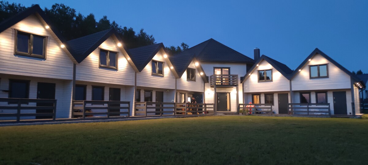 Je vous invite dans de nouvelles maisons de ville à Rssi Rusinowo, où vous pourrez trouver le calme et la tranquillité en famille, entourées de verdure. Tous les gîtes sont isolés, ce qui garantit une température confortable en été. Chaque chalet dispose d'un barbecue en brique, d'une balançoire et d'un banc dans son jardin. Lorsque vous buvez votre café du matin sur la terrasse, vos enfants jouent sur l'aire de jeux devant la maison. À proximité, vous pourrez acheter de la nourriture maison, du miel, du fromage et des œufs. La plage se trouve à 5 minutes à pied ou en voiture.