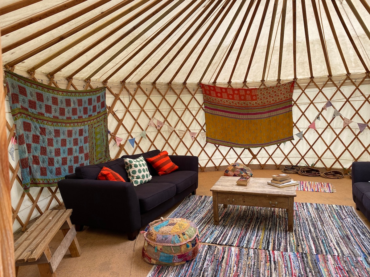 Construite à la main par moi-même et Mamie Mongolie, la yourte est un mélange de design mongol traditionnel et de chic bohème. En entrant dans la yourte, vous remarquerez instantanément un sentiment de calme et d'ancrage, une retraite idéale d'un style de vie trépidant. Entourée par la campagne, la yourte abrite de nombreux objets mongols qui m'ont été offerts par Mamie Mongolie. Elle dispose d'un barbecue au charbon de bois et d'une cuisinière. À l'extérieur, il y a un grand coin repas, une cuisine extérieure et une salle de bain extérieure. Espace adapté aux enfants. Vu sur BBC2 My Unique B&B.
