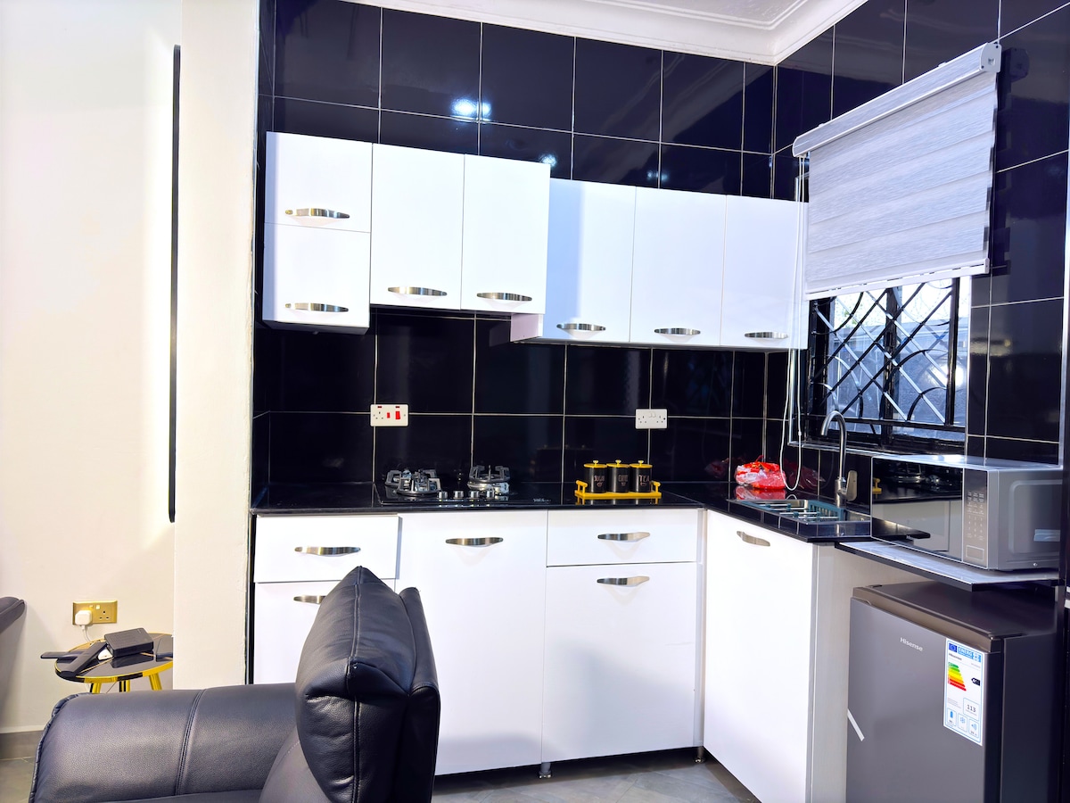 Tanzi homes est un logement moderne et élégant de 8 chambres, 8 salles de bain et 8 séjours, offrant un mélange parfait de confort, d'élégance et de commodité. Conçu pour les touristes, les petites familles et les professionnels, il se trouve dans un environnement serein et sécurisé, ce qui en fait l'endroit idéal pour séjourner. *Salon* Les grandes portes coulissantes offrent une lumière naturelle et une aération au salon, - Télévision connectée 55 pouces avec Netflix, Wi-Fi - Balcon avec de la verdure - Réfrigérateur - Cuisinière à gaz et électrique - Four à micro-ondes - Fer à repasser à plat Teinture à cheveux Machine à laver