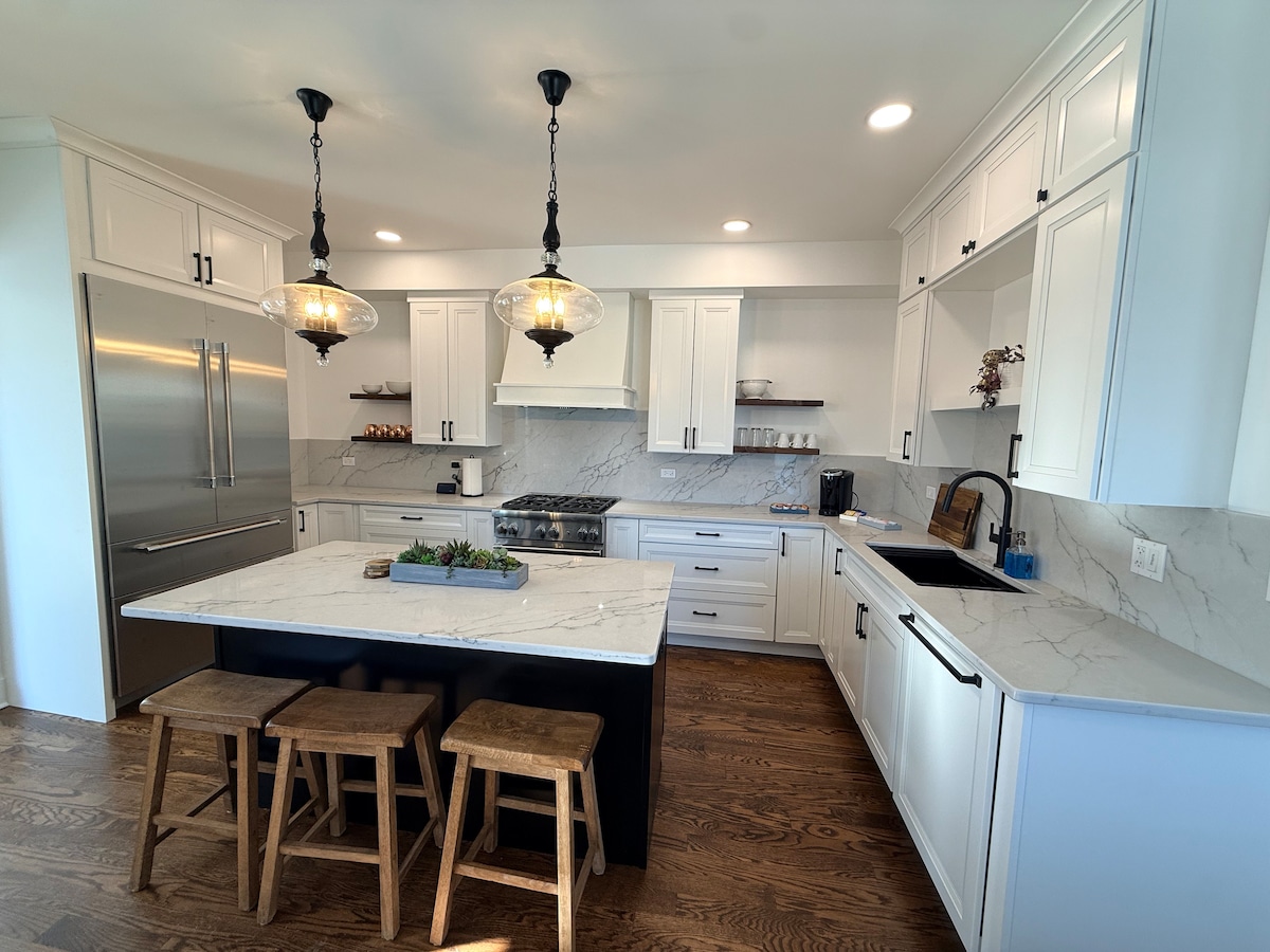 Ce logement dispose d'un salon spacieux, d'une cuisine entièrement équipée et de trois chambres avec des lits confortables. Une salle de récréation de niveau inférieur avec canapé confortable et table de billard Idéalement situé à proximité de l'aéroport, vous pouvez facilement vous rendre à vos vols et en revenir. Explorez les attractions, restaurants, boutiques à proximité ou faites un court trajet en voiture dans la ville animée de Chicago Si vous êtes à la recherche d'une retraite tranquille ou d'une aventure urbaine passionnante, cette belle maison est le choix idéal pour votre séjour.