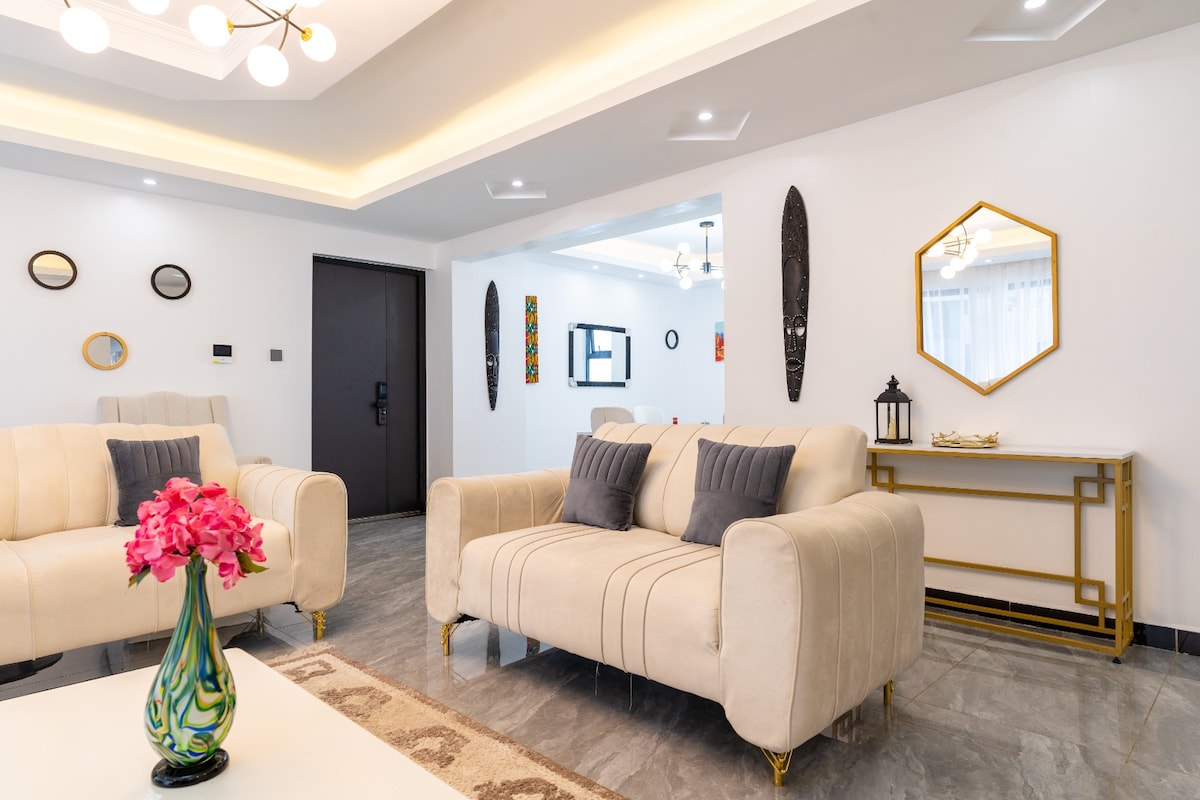 🏡 Bienvenue dans votre élégant appartement exécutif d'une chambre au cœur de Lavington, parfait pour les couples💑, les voyageurs d'affaires ou les 💼escapades de fin de semaine 🌇! ✨ Profitez d'un confort moderne avec un salon spacieux ouvert 🛋️, une cuisine entièrement équipée 🍳, ainsi qu'un lave-linge et un sèche-linge pour votre confort 👕🧺, et une alimentation électrique fiable ⚡. 📺 Détendez-vous avec des divertissements sur une télévision connectée 75"(Netflix🎬, YouTube Premium▶️, IPTV gratuite📡) ou détendez-vous avec la PlayStation 4 🎮 après une longue journée.