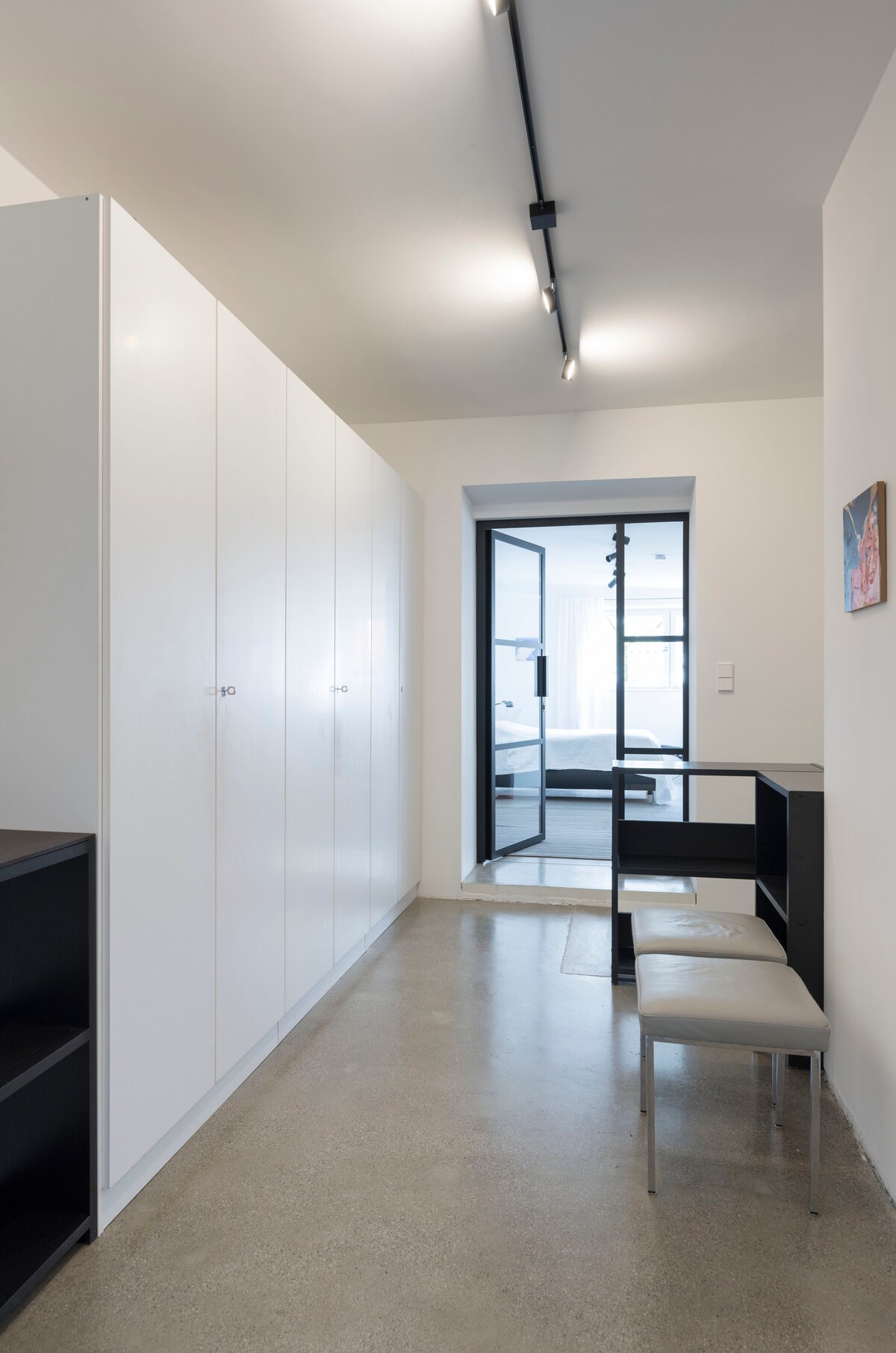 Cet appartement en sous-sol confortable et calme avec lit king-size (180x200 cm, 2 matelas simples), table double et canapé d'angle est parfait pour se détendre. Climat ambiant agréable avec chauffage par le sol, hauteur de plafond 3,50 mètres, puits de lumière très profond offrant la lumière du jour (limité en raison du sous-sol). Wellness supplémentaire : la ceinture et le pistolet de massage sont à disposition. Le canapé (120 cm de large) est extensible et offre éventuellement un hébergement pour une troisième personne.
