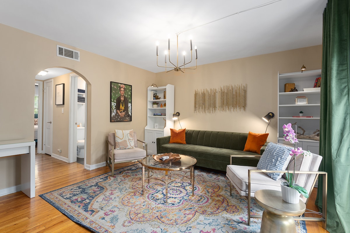 ⛲ 2 chambres confortables avec lit Queen Size + 1 salle de bain complète avec articles de toilette Tommy Bahama Salon ⛲ spacieux avec convertible + télévision connectée 65" Salle à⛲ manger avec 6 places assises, café complet et bar à cocktails Cuisine ⛲ entièrement équipée avec appareils en acier inoxydable et produits de base Véranda ⛲ unique avec salle de sport et espace de méditation, et jardin Parking ⛲ gratuit désigné + accessible à pied au Country Club Plaza et Westport de Kansas City ⛲ Animaux acceptés avec arrière-cour clôturée