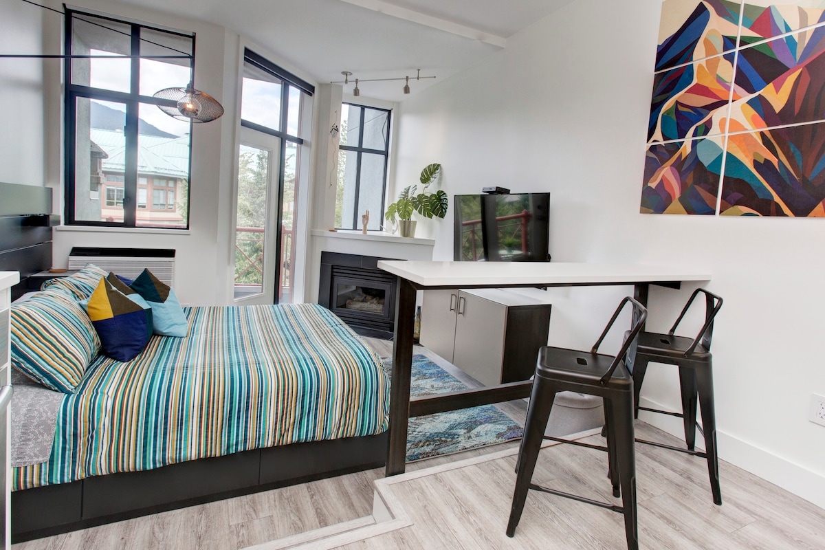 *Remarque : informations sur la fermeture du JACUZZI⬇️ EMPLACEMENT EMPLACEMENT ! Ce studio lumineux et ensoleillé récemment rénové surplombe l'emblématique promenade du village de Whistler ! **PARKING GRATUIT ** LIT KING SIZE **Jacuzzi **Salle de sport **Air climatisé ** Buanderie dans la suite ** Casier à ski Marchez jusqu'à tout, y compris la télécabine (même en chaussures de ski !) **Le jacuzzi est en cours de rénovation : FERMÉ jusqu'à fin mars 2026 **La salle de sport est en cours de rénovation : FERMÉE jusqu'à fin mars 2026